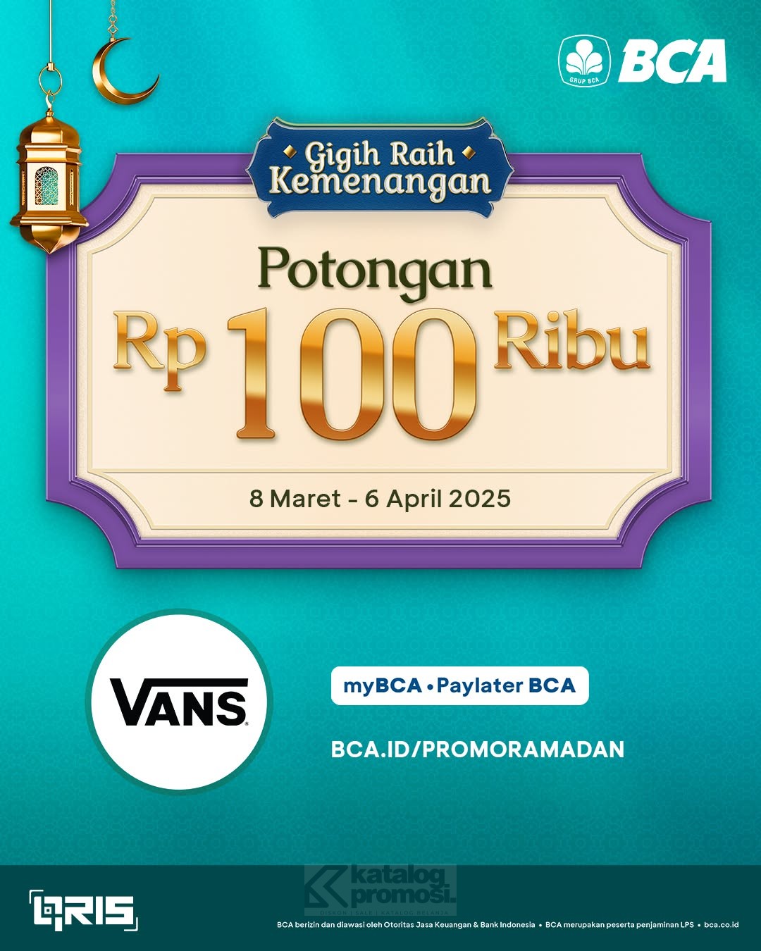 Promo Adidas & VANS! Diskon Rp. 100.000 dengan min. transaksi Rp. 1.000.000 via QRIS myBCA & Paylater BCA. Berlaku setiap Sabtu & Minggu hingga 6 April 2025!