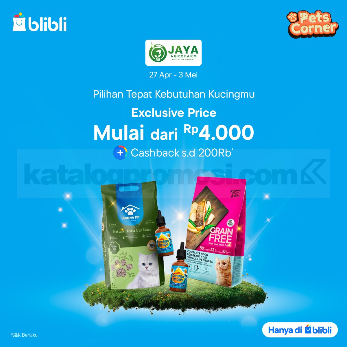 Promo Agrofarmjaya kebutuhan kucing mulai Rp. 4.000 cashback hingga Rp. 200.000 di Blibli berlaku 27 April 2026 – 3 Mei 2026.