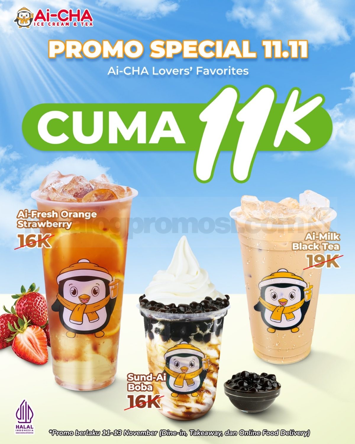 Promo Ai-CHA 11.11 Menu Favorit Mulai Rp. 11.000 berlaku 11โ13 November 2025 untuk Dine-in, Takeaway, dan Online Delivery di outlet Ai-CHA tertentu.
