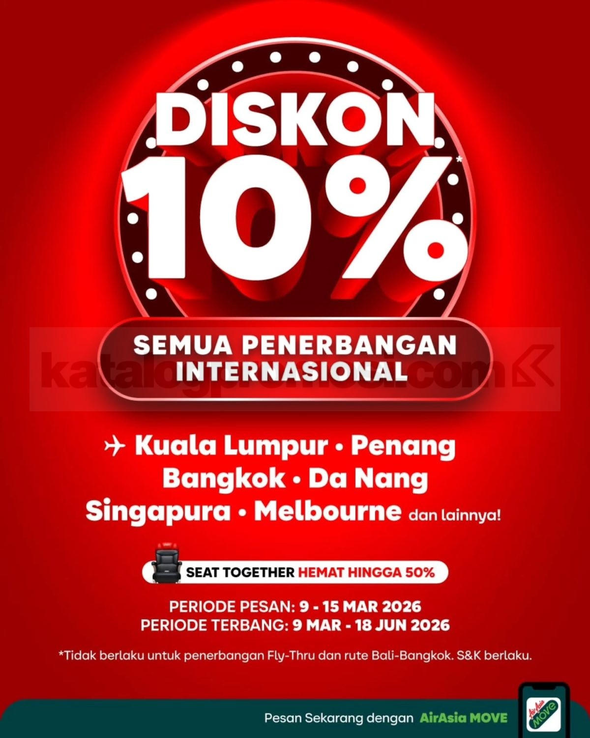 Promo AirAsia Diskon 10% Penerbangan Internasional periode pesan 9 – 15 Maret 2026 untuk perjalanan hingga 18 Juni 2026 melalui AirAsia MOVE dan website.