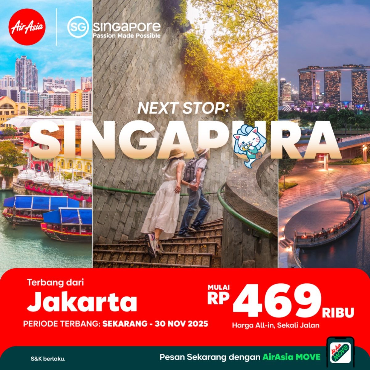 Promo AirAsia Next Stop Singapura mulai Rp469 ribu all-in sekali jalan pesan via AirAsia MOVE berlaku sampai 07 September 2025 untuk terbang hingga 30 November 2025 dari Jakarta.