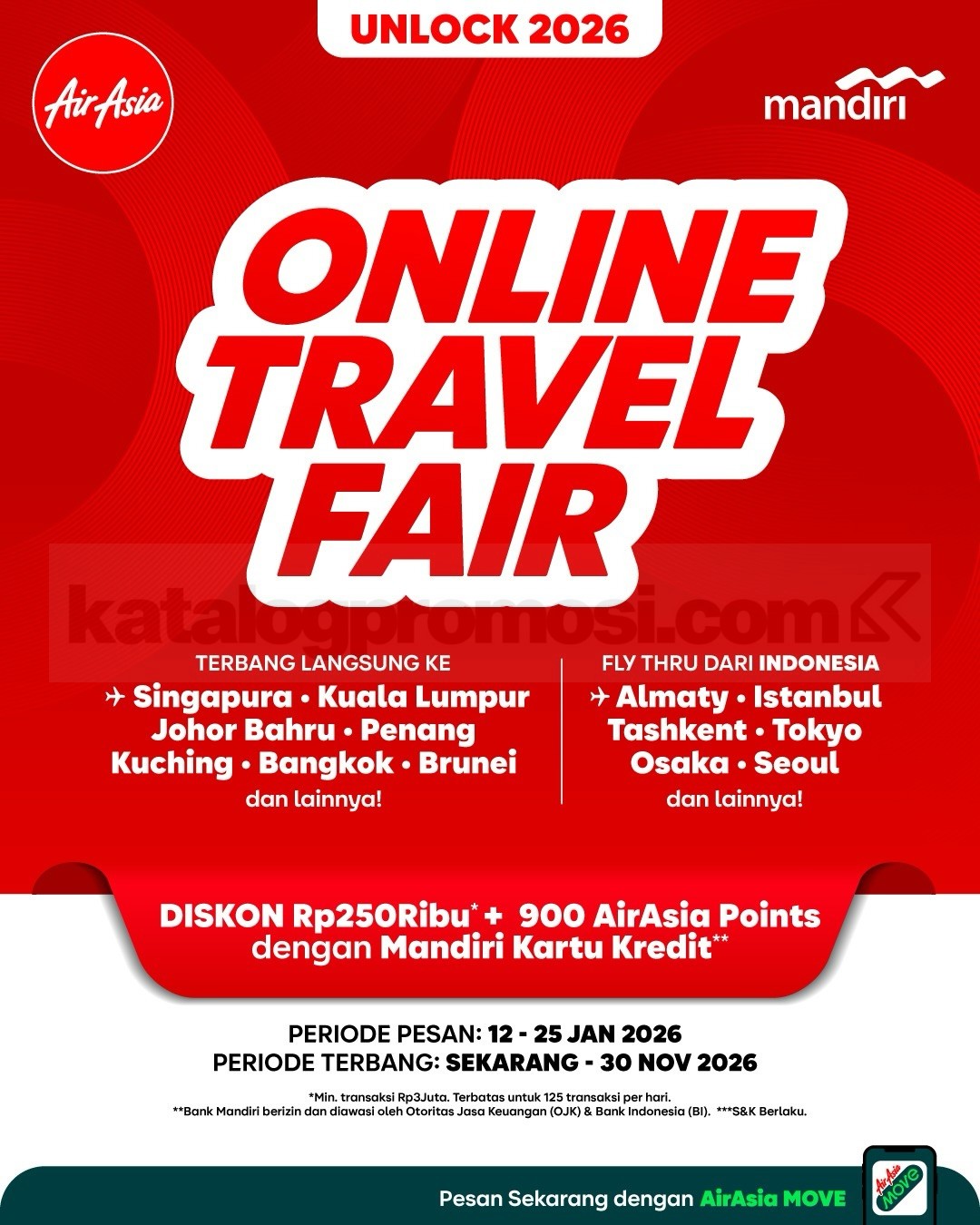 Promo AIRASIA Online Travel Mandiri 2026 diskon Rp. 250.000 + 900 AirAsia Points berlaku periode pesan 12 – 25 Januari 2026 untuk penerbangan domestik dan internasional.