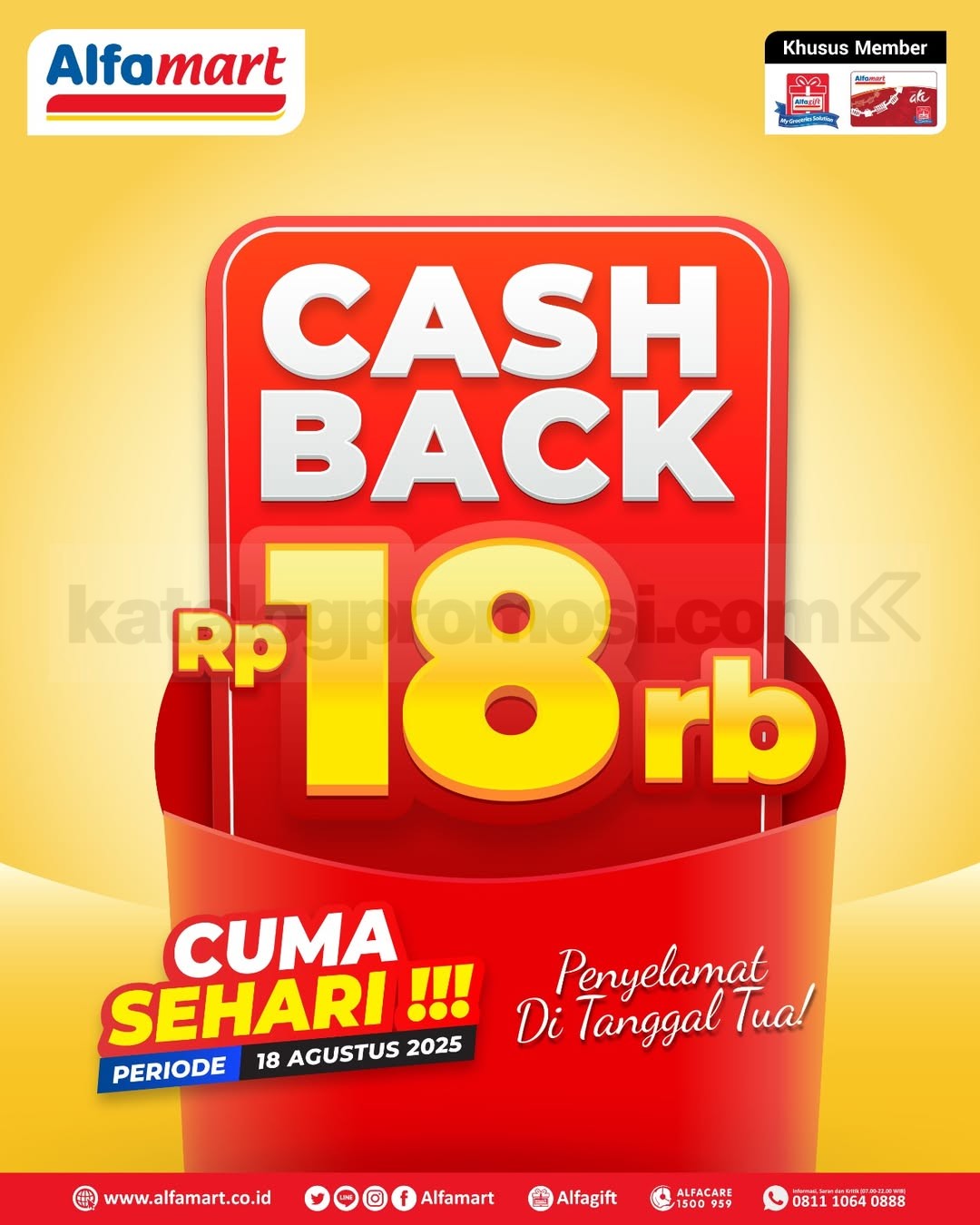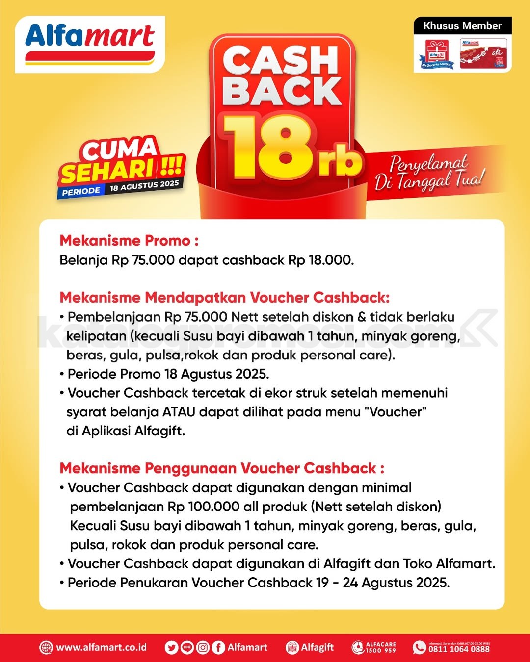 Promo Alfamart Belanja Dapat Cashback Rp18.000 berlaku tanggal 18 Agustus 2025 khusus member Alfamart dengan minimum belanja Rp75.000 nett setelah diskon.