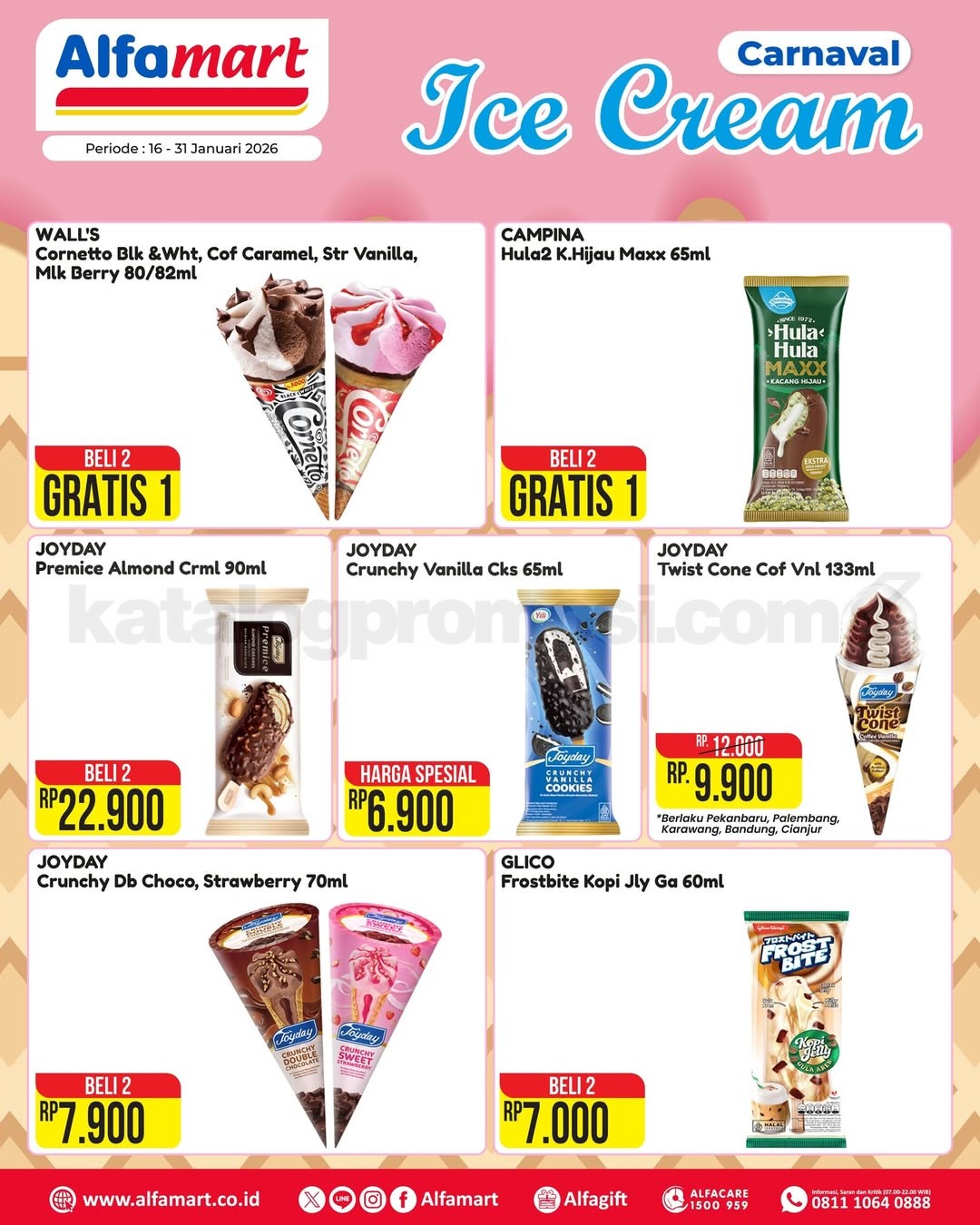 Promo Alfamart Carnaval Ice Cream mulai Rp6.900, banyak pilihan es krim seru dan bundling hemat, berlaku mulai tanggal 16-31 Januari 2026 di toko dan Alfagift!