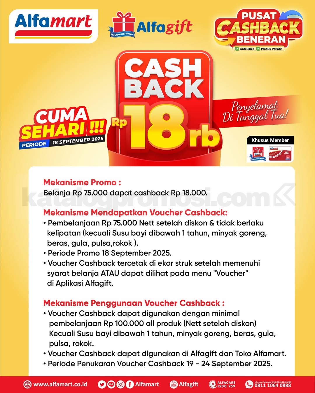 Promo ALFAMART Cashback Rp18.000 hanya 1 hari berlaku 18 September 2025. Belanja minimal Rp. 75.000 langsung dapat voucher cashback Rp. 18.000, bisa dipakai 19β24 September 2025.