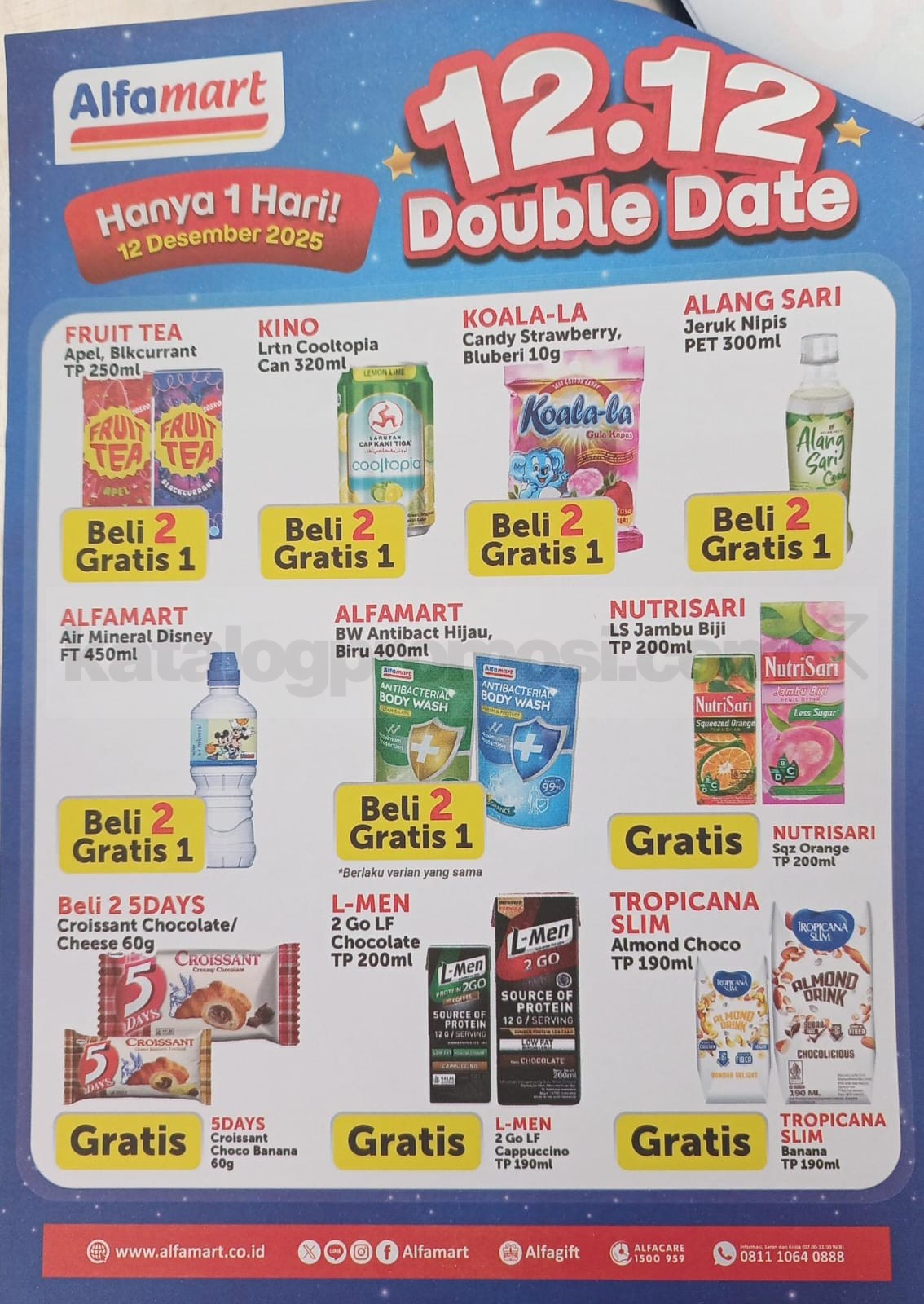 Promo Alfamart Double Date 12.12 Beli 1 Gratis 1 & Beli 2 Gratis 1 berlaku 12 Desember 2025 di seluruh outlet & aplikasi Alfagift, banyak pilihan produk dari snack hingga body care.