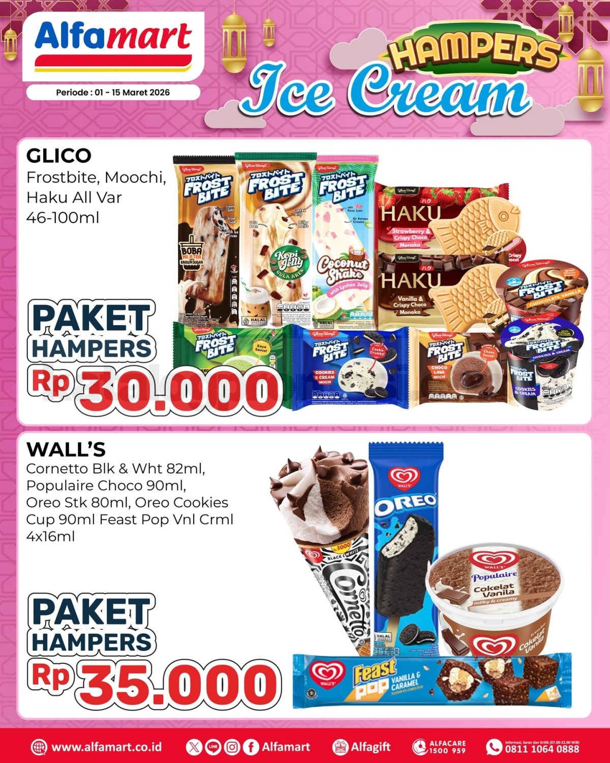 Promo Alfamart Hampers Ice Cream mulai Rp. 30.000 periode 01 – 15 Maret 2026 tersedia di toko Alfamart dan aplikasi Alfagift untuk paket ice cream pilihan.