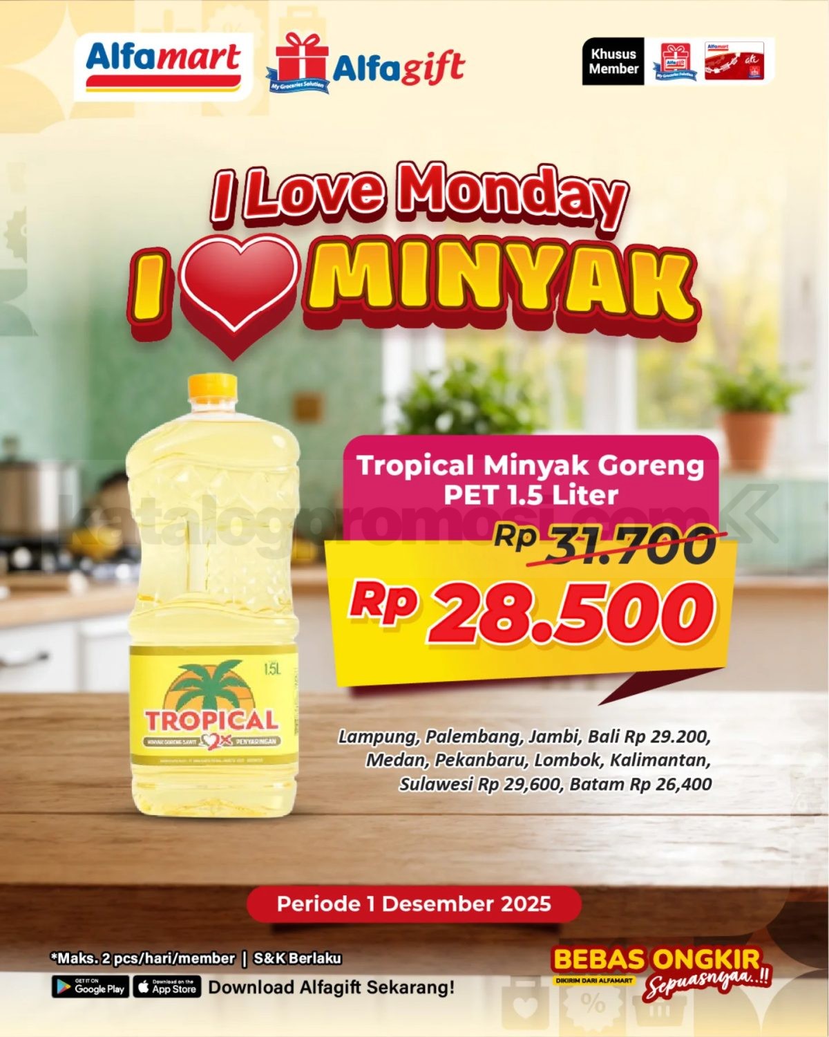 Promo Alfamart I Love Monday Minyak Goreng mulai Rp. 28.500 untuk member, berlaku mulai tanggal 1 Desember 2025 di lokasi tertentu dengan maksimal pembelian 2 pcs per hari.