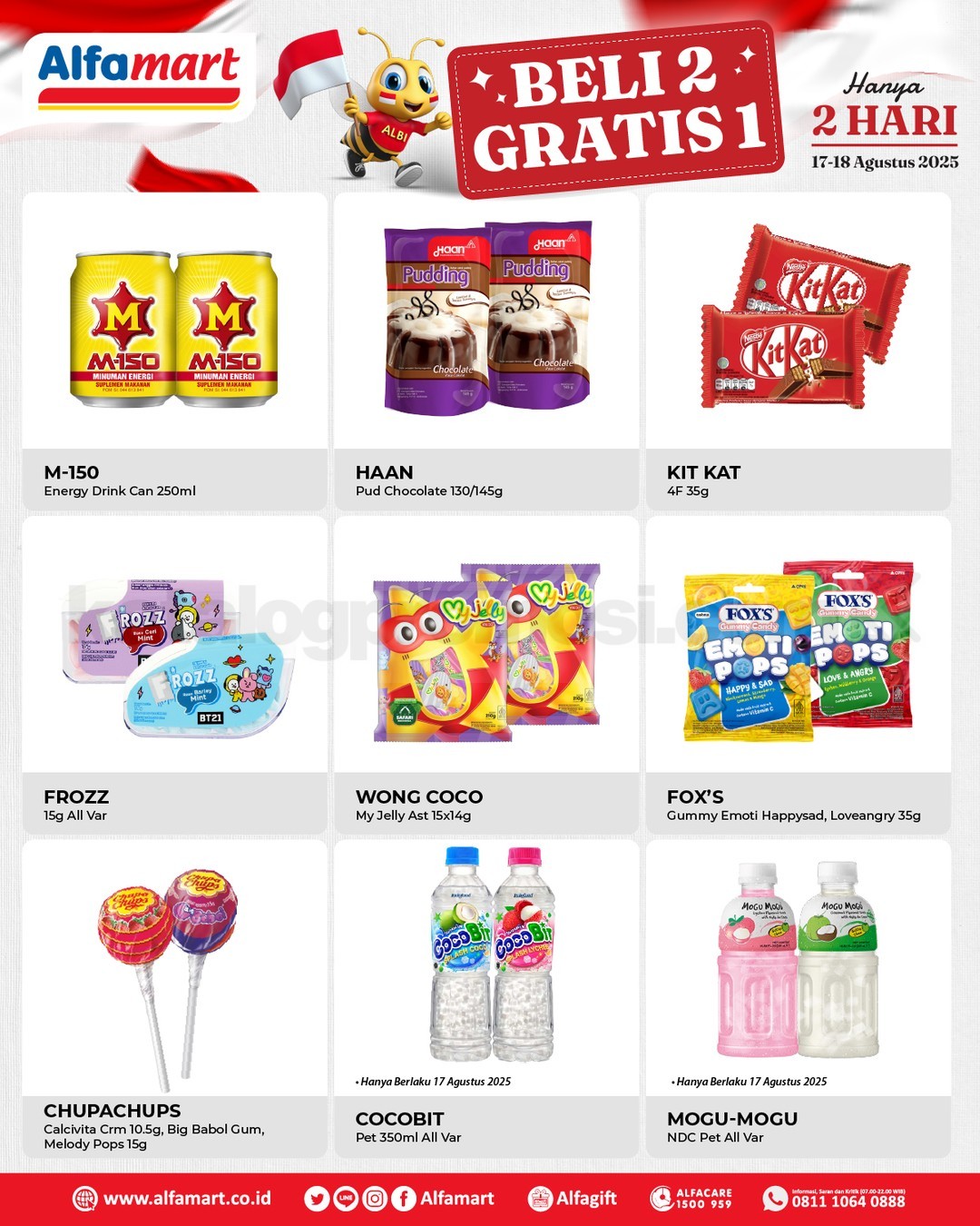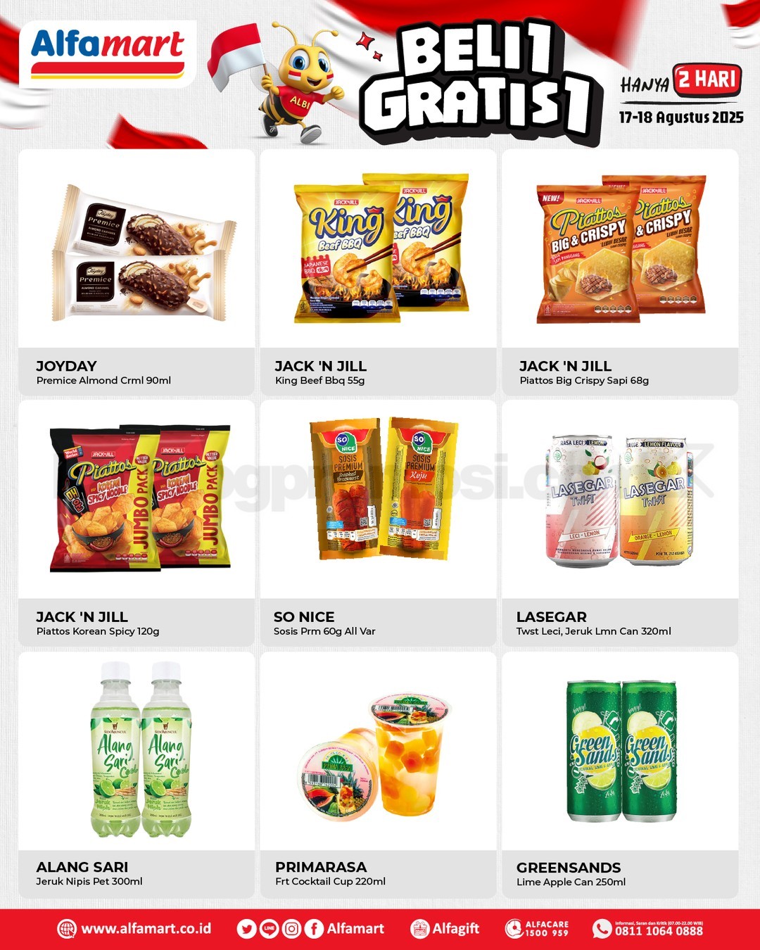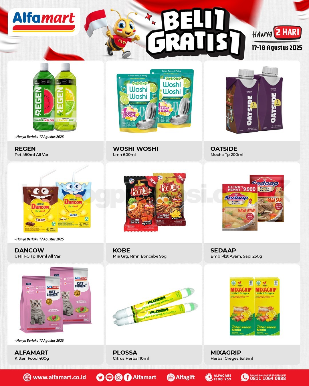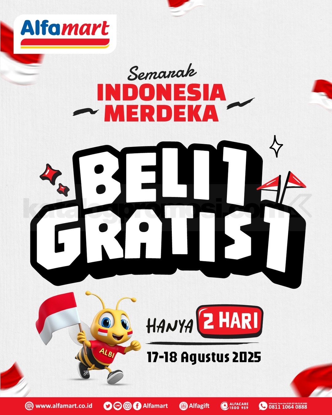 Promo Alfamart Merdeka Double Hemat dengan penawaran beli 1 gratis 1 hingga beli 2 gratis 1 berlaku 17โ18 Agustus 2025 di Alfamart & aplikasi Alfagift.