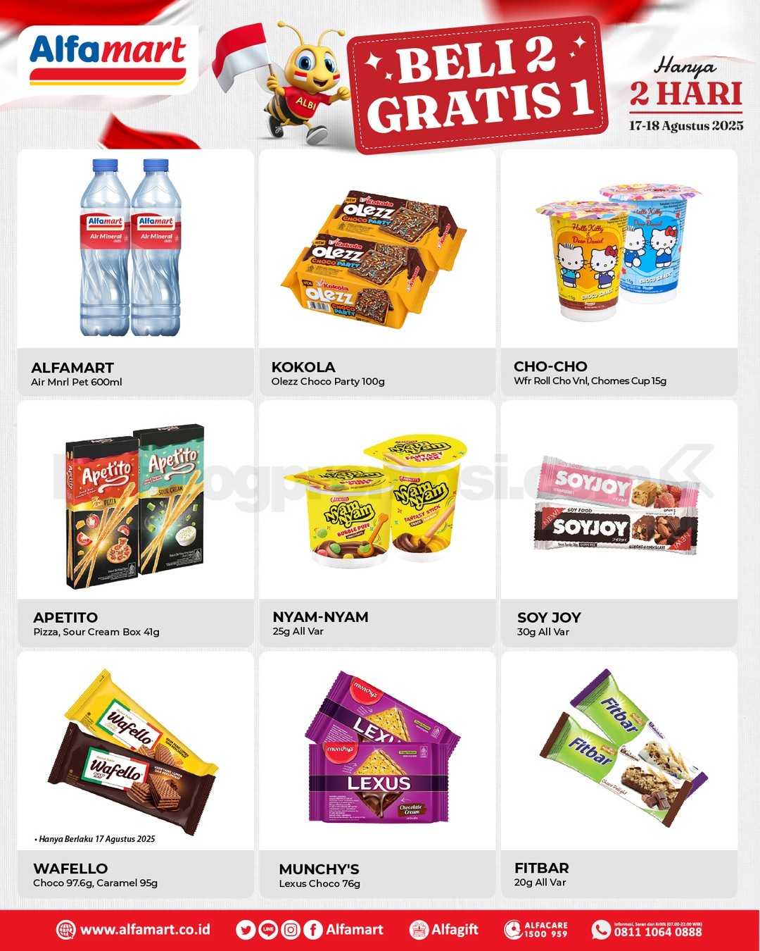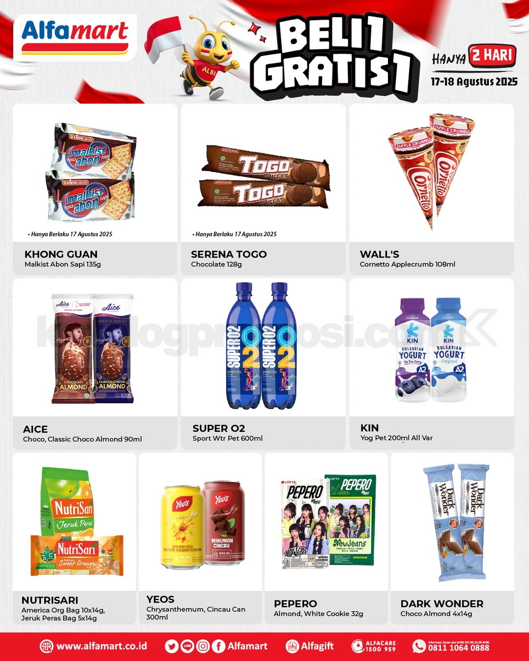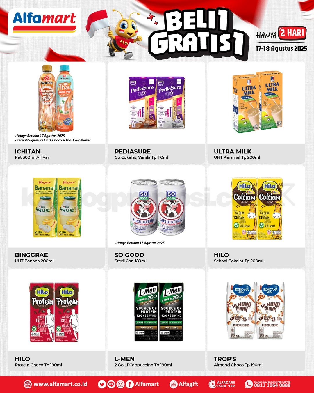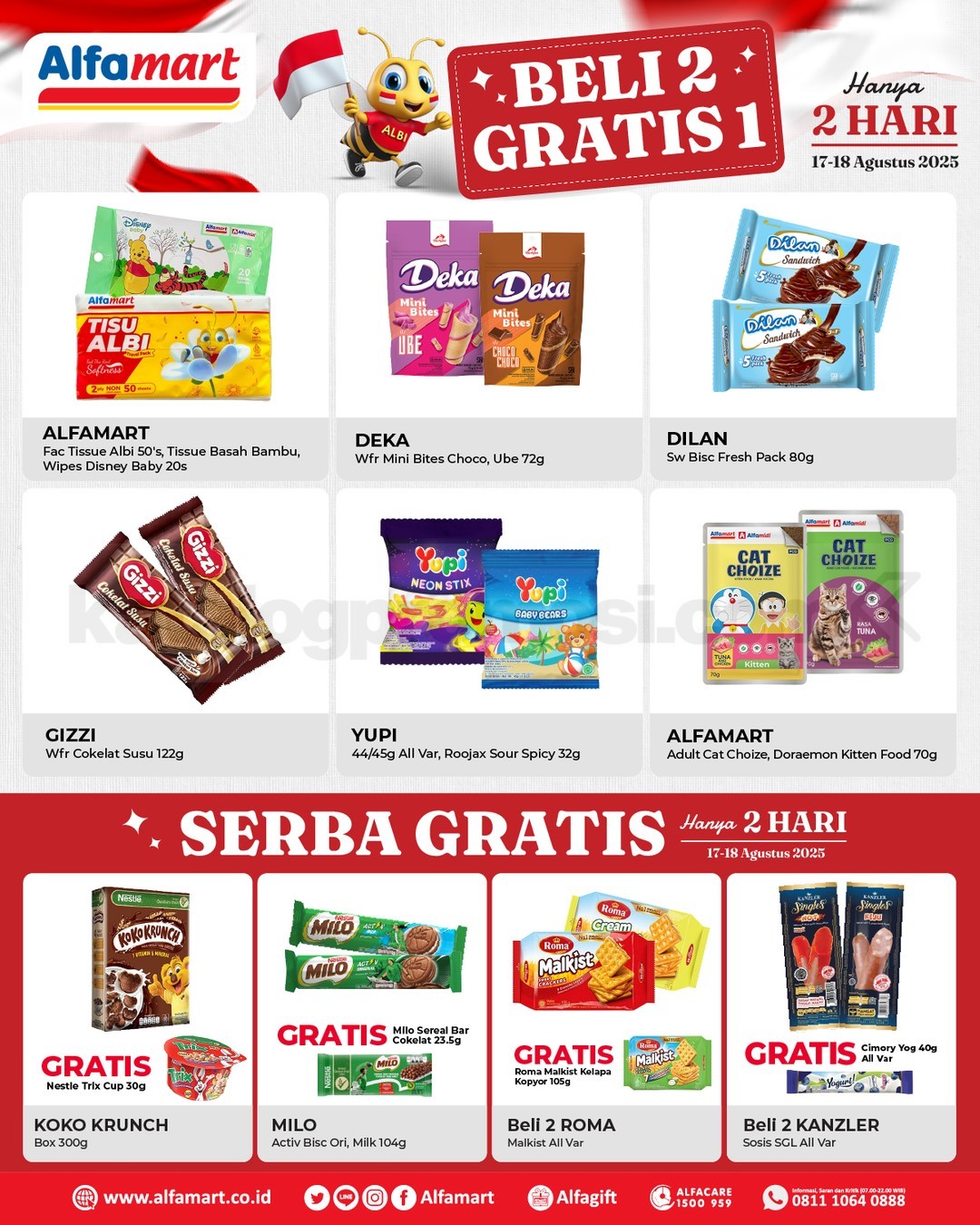 Promo Alfamart Merdeka Double Hemat dengan penawaran beli 1 gratis 1 hingga beli 2 gratis 1 berlaku 17โ18 Agustus 2025 di Alfamart & aplikasi Alfagift.