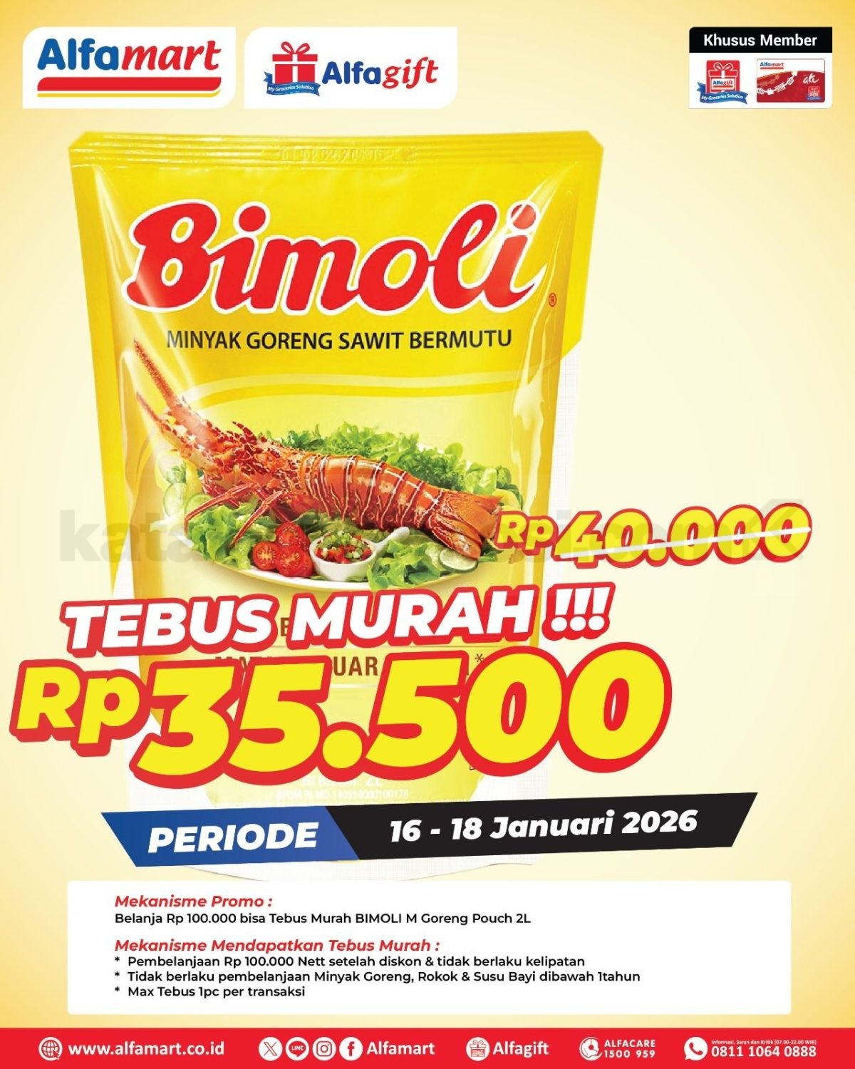 Promo ALFAMART Tebus Murah BIMOLI Minyak Goreng Rp. 35.500 berlaku 16 – 18 Januari 2026 dengan belanja Rp. 100.000 khusus member di gerai tertentu dan via aplikasi ALFAGIFT.