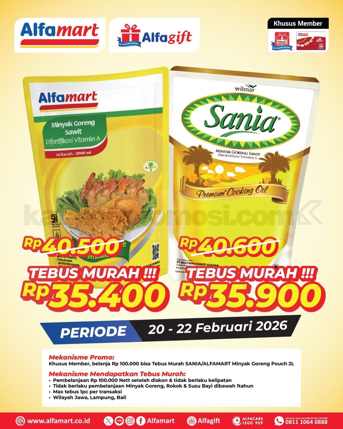 Promo Alfamart Tebus Murah Minyak Goreng 2L periode 20 – 22 Februari 2026 khusus member, belanja Rp100.000 tebus mulai Rp35.400 sesuai wilayah.