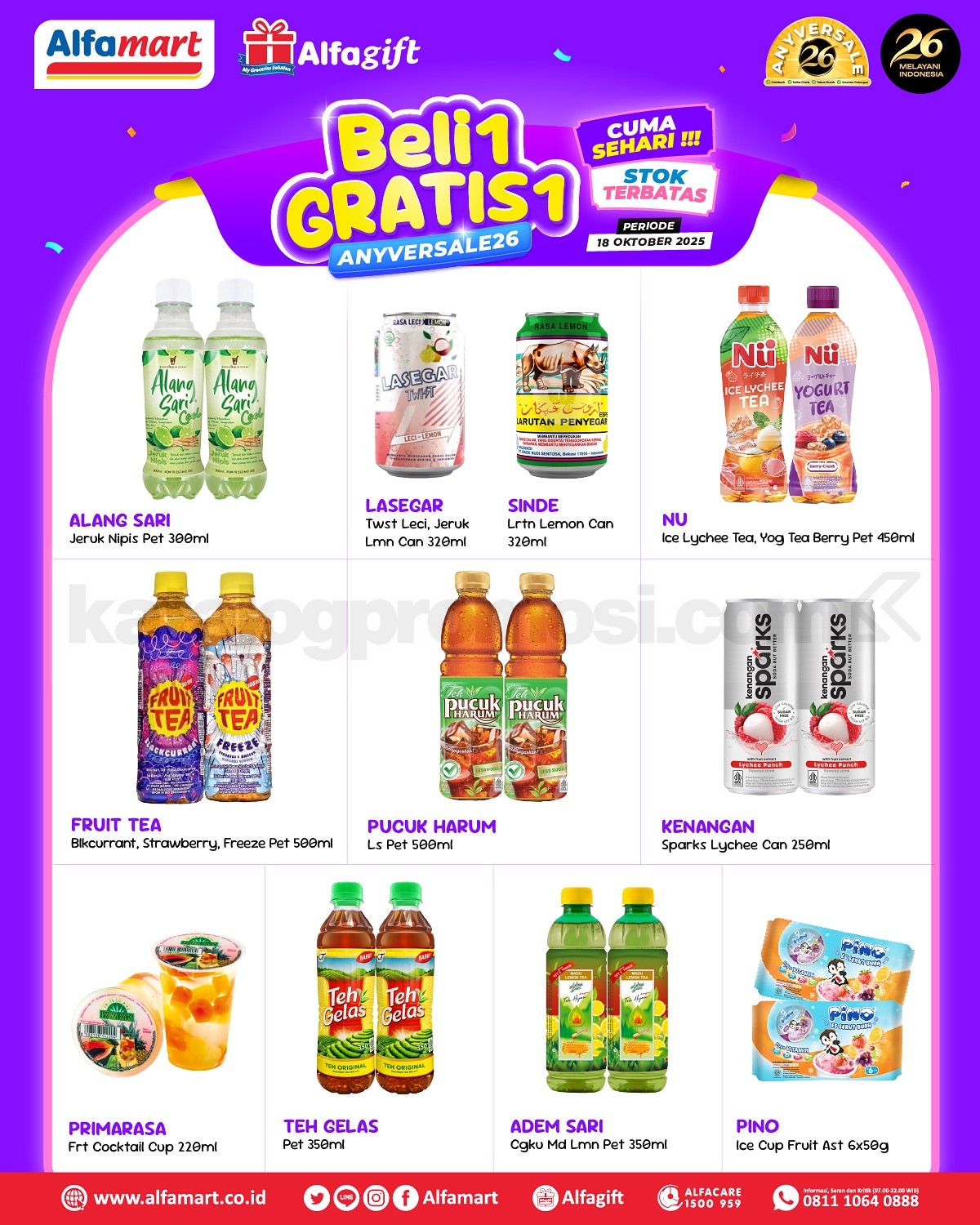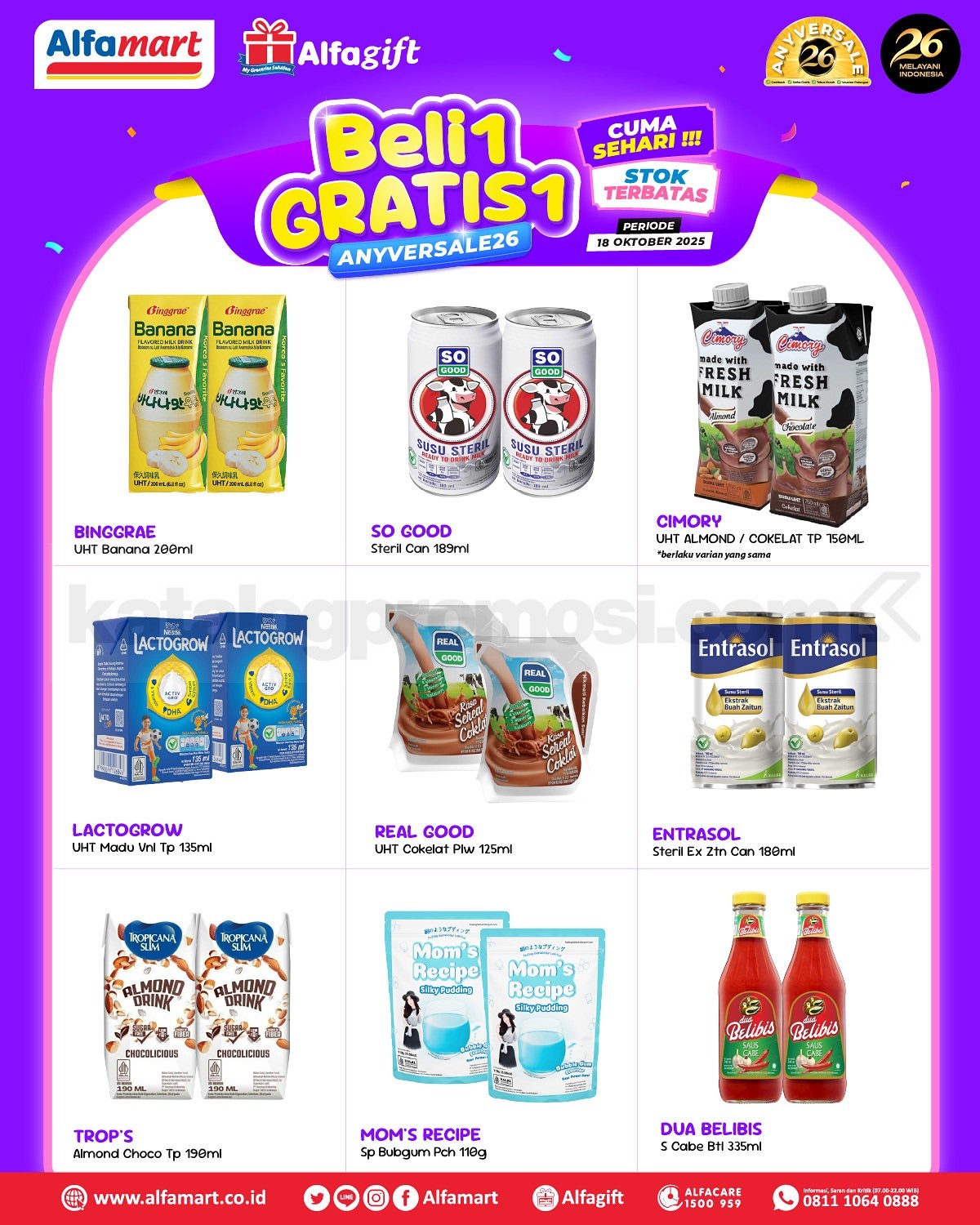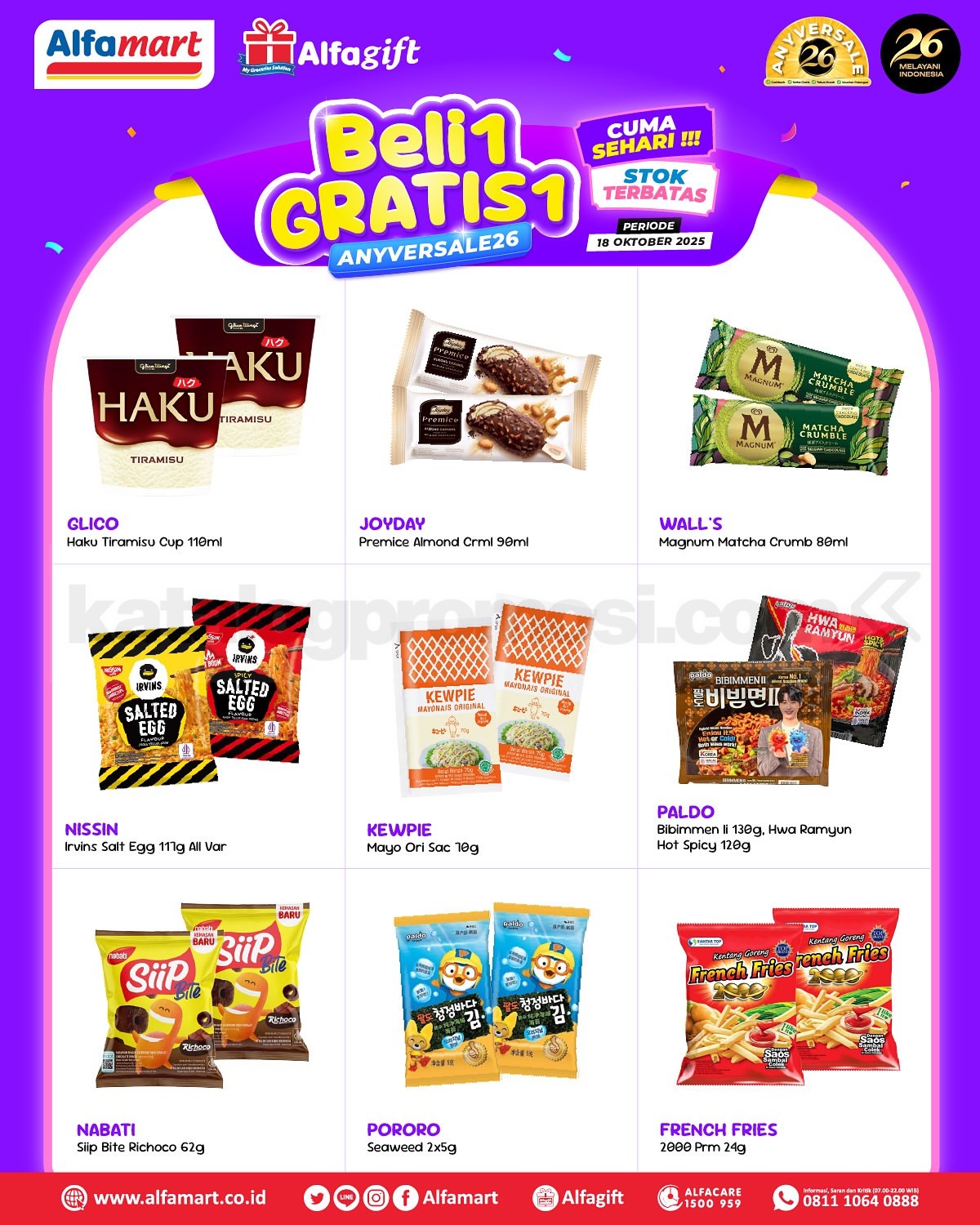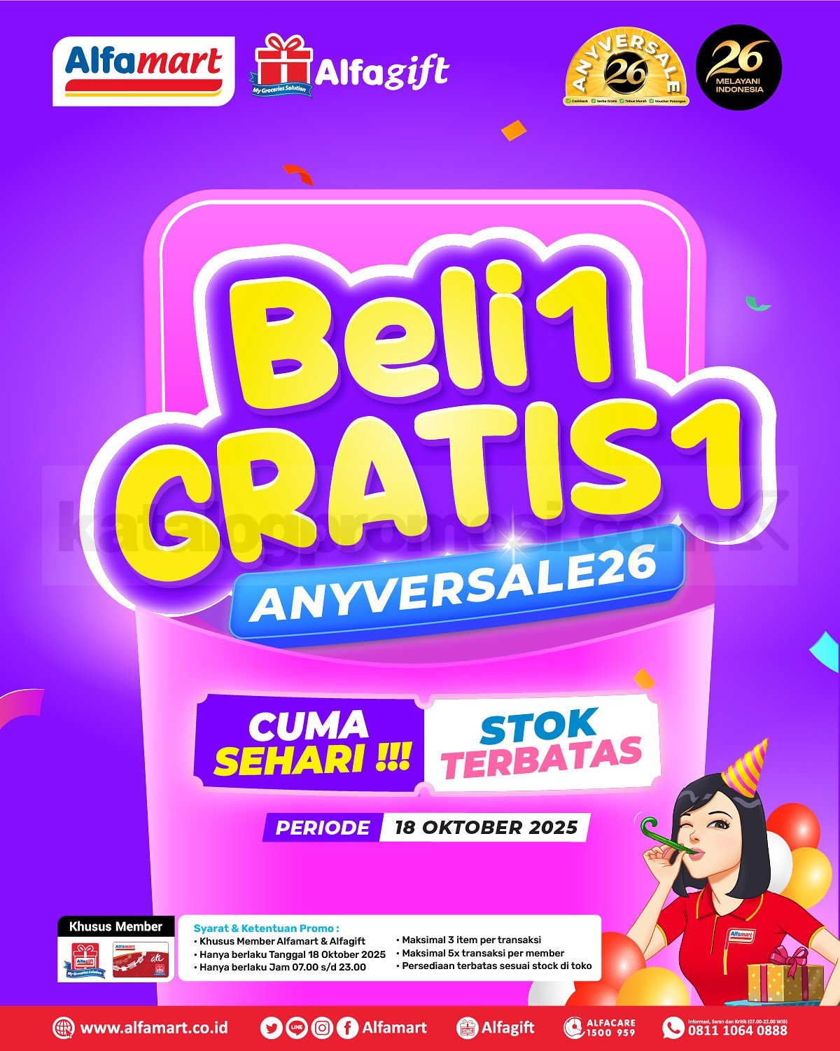 Promo ALFAMART ULANG TAHUN 26 ANNIVERSARY SALE Beli 1 Gratis 1 โ berlaku 18 Oktober 2025 di seluruh gerai Alfamart & Alfagift. Nikmati juga promo Serba Gratis spesial 1 hari!