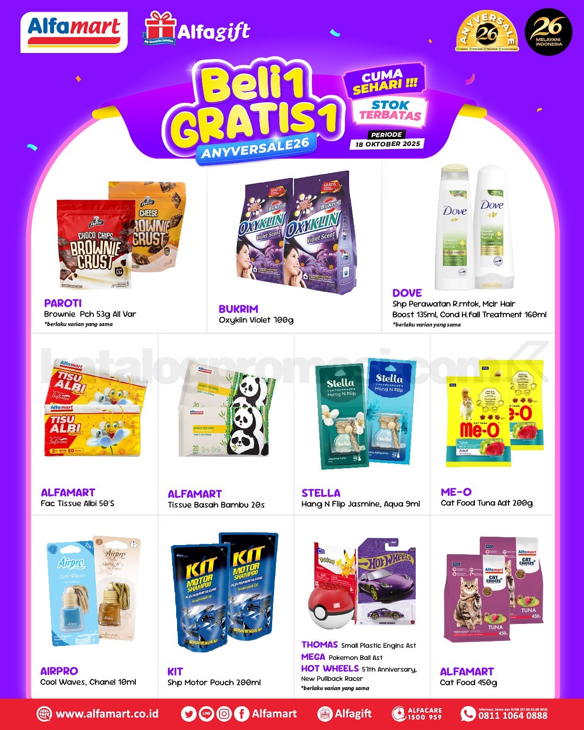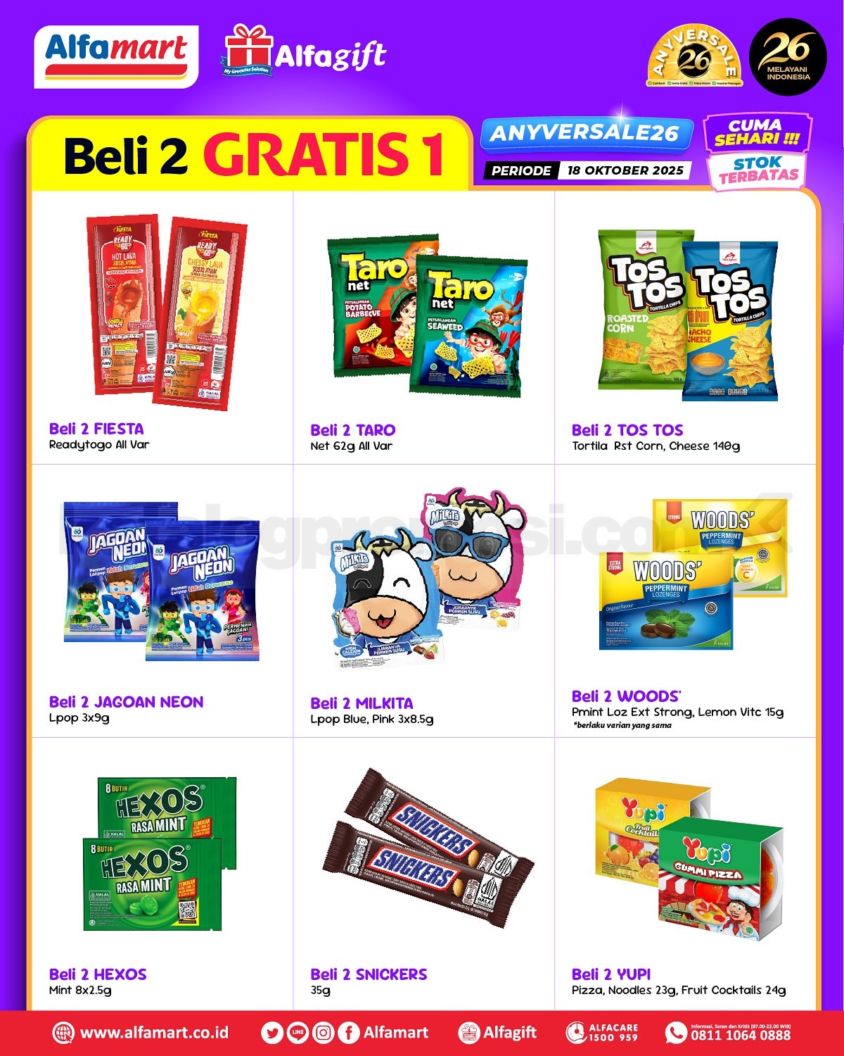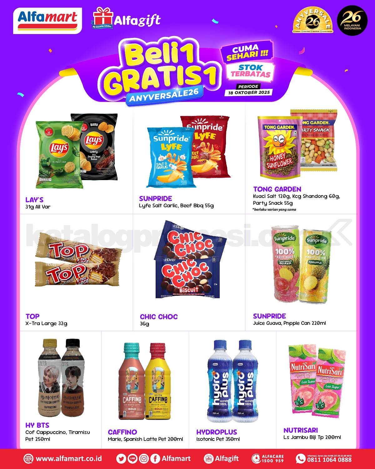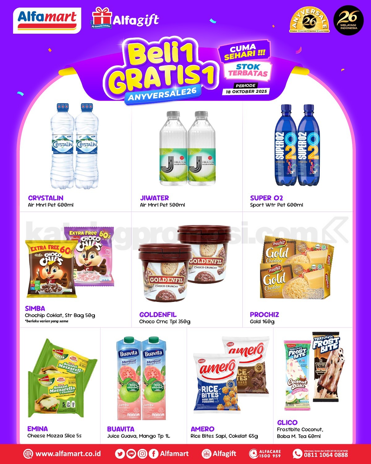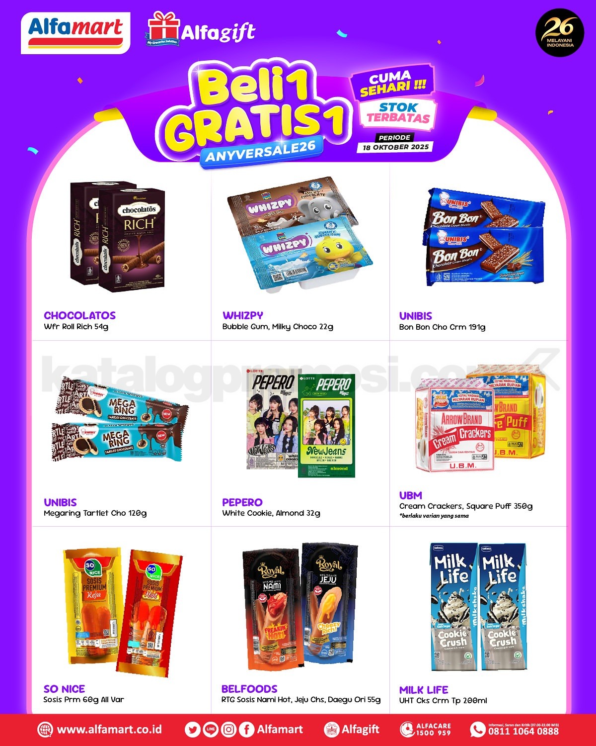 Promo ALFAMART ULANG TAHUN 26 ANNIVERSARY SALE Beli 1 Gratis 1 โ berlaku 18 Oktober 2025 di seluruh gerai Alfamart & Alfagift. Nikmati juga promo Serba Gratis spesial 1 hari!