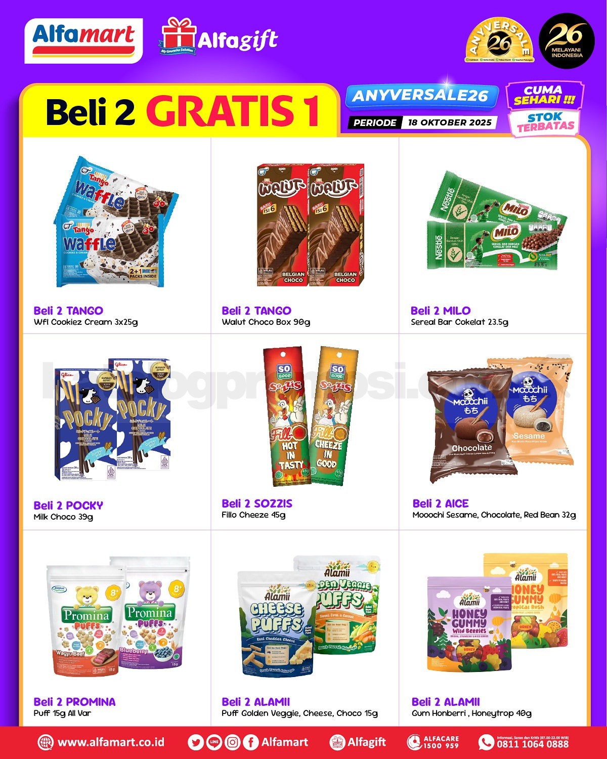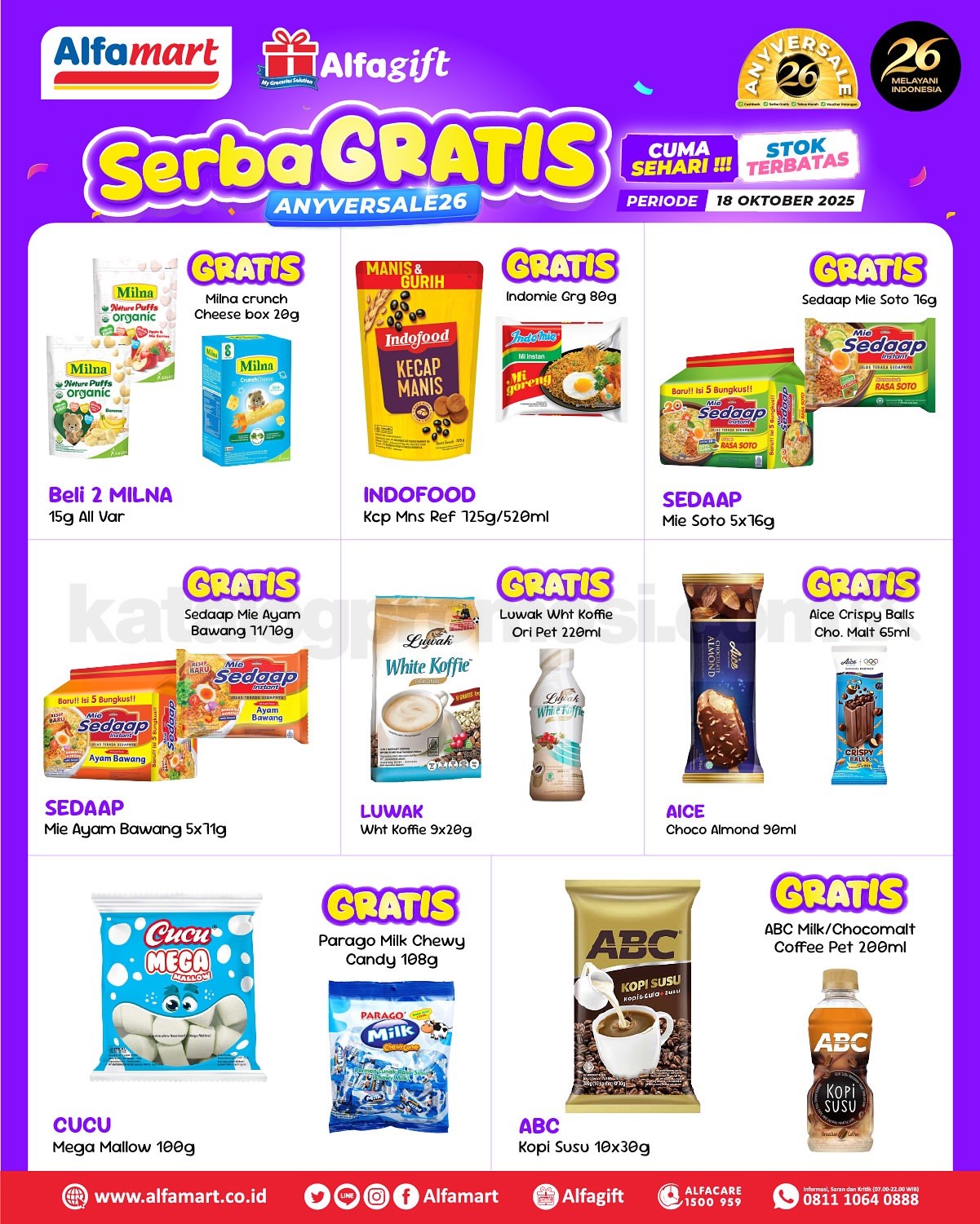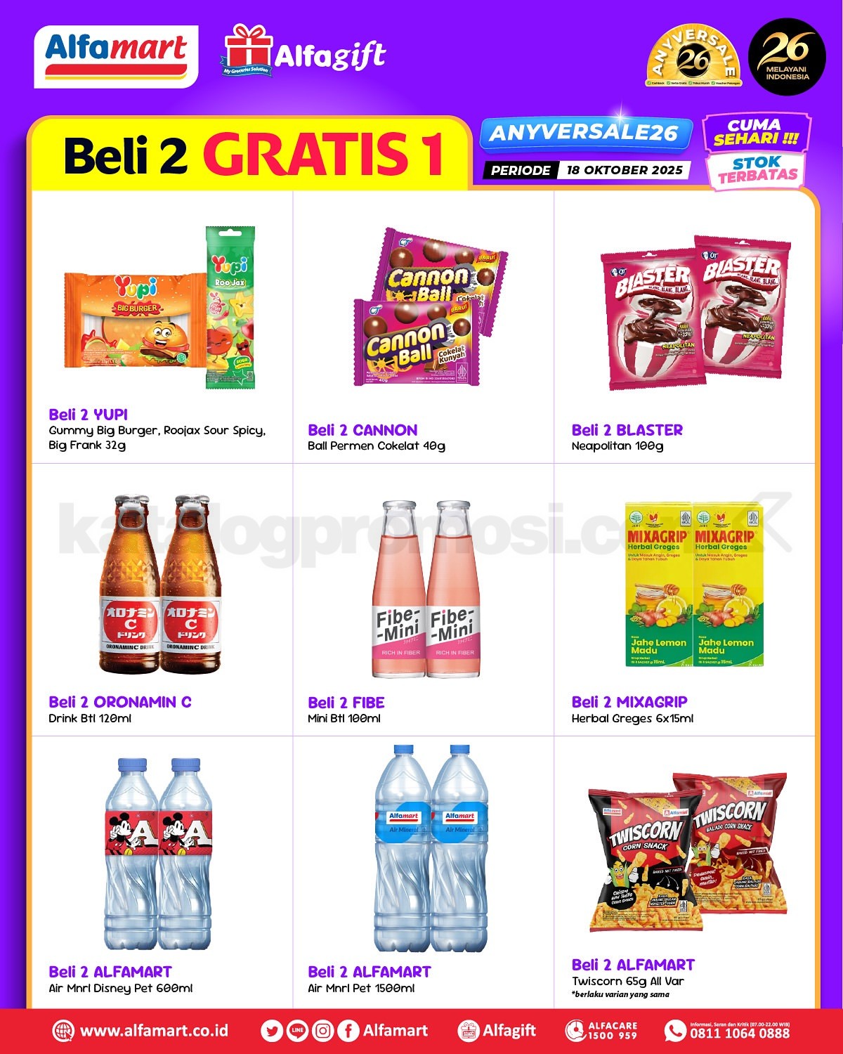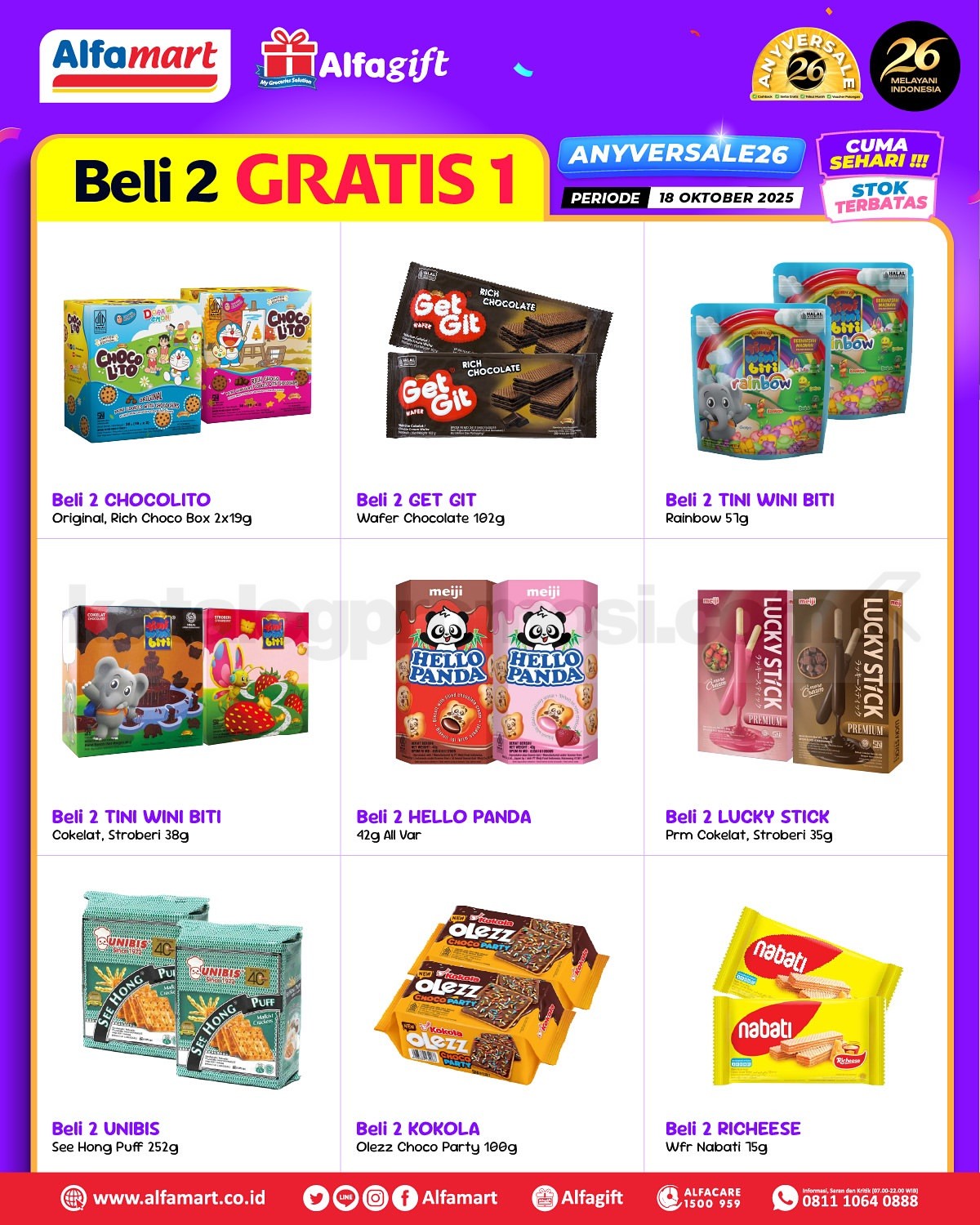 Promo ALFAMART ULANG TAHUN 26 ANNIVERSARY SALE Beli 1 Gratis 1 โ berlaku 18 Oktober 2025 di seluruh gerai Alfamart & Alfagift. Nikmati juga promo Serba Gratis spesial 1 hari!