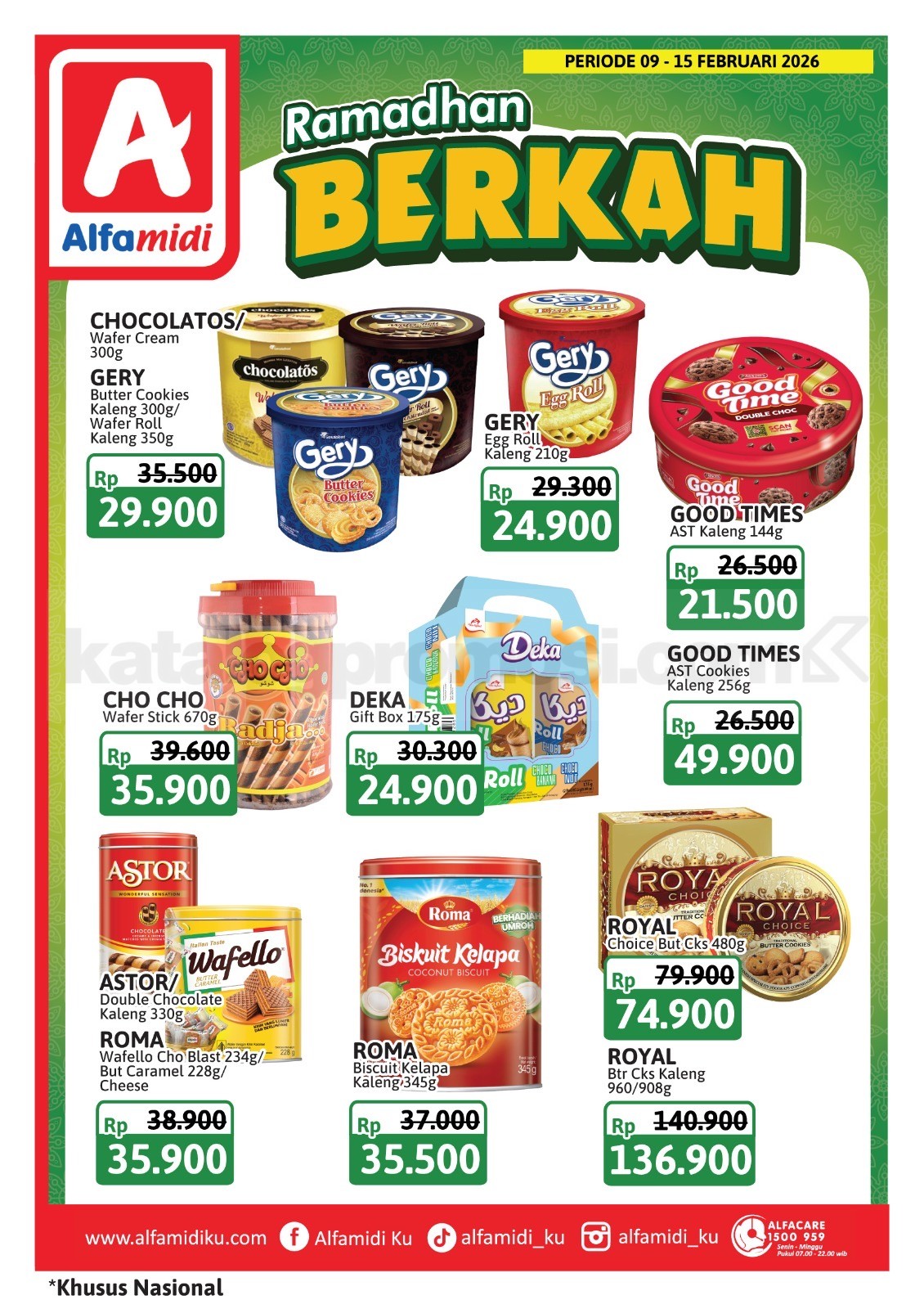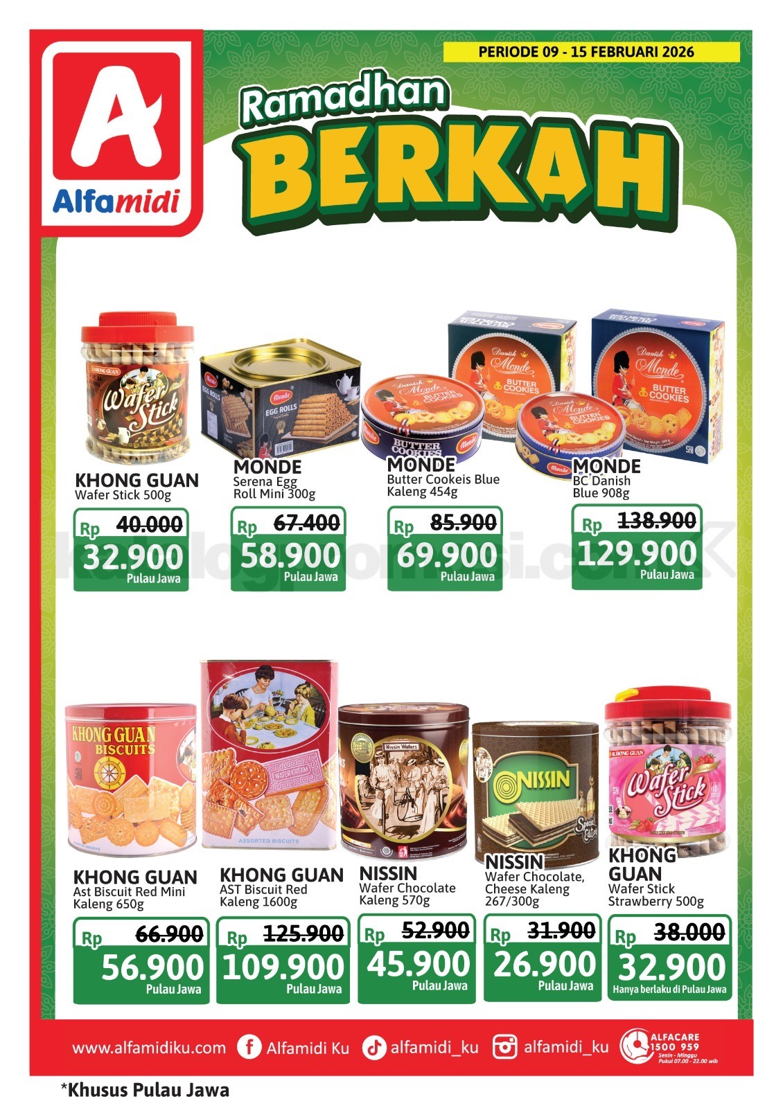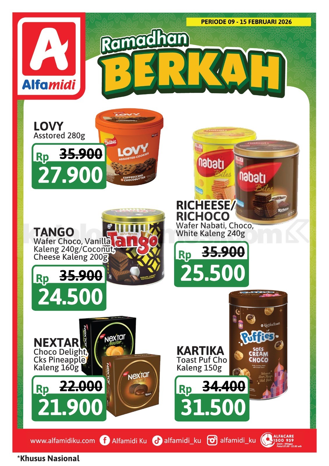 Promo Alfamidi Biskuit Ramadhan Berkah harga spesial aneka biskuit dan wafer kaleng berlaku 09 β 15 Februari 2026 di seluruh outlet, stok menyesuaikan.
