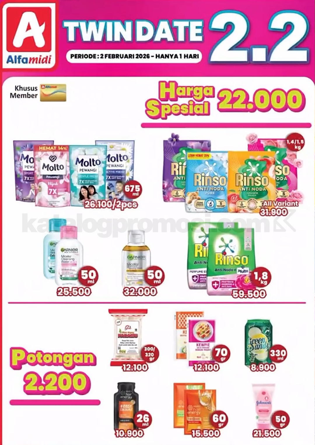 Mulai dari beli 1 gratis 1, potongan harga Rp. 2.200, diskon 22%, sampai harga spesial Rp. 22.000 untuk produk tertentu. Semuanya berlaku hanya di tanggal 02 Februari 2026, jadi tinggal pilih promo mana yang paling pas buat kebutuhanmu.