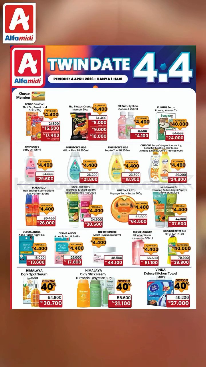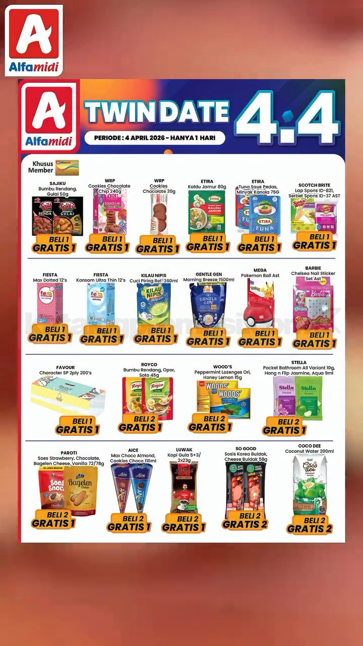 Promo Alfamidi Double Date 4.4 Beli 1 Gratis 1 berlaku khusus 04 April 2026 dengan berbagai keuntungan spesial satu hari saja.