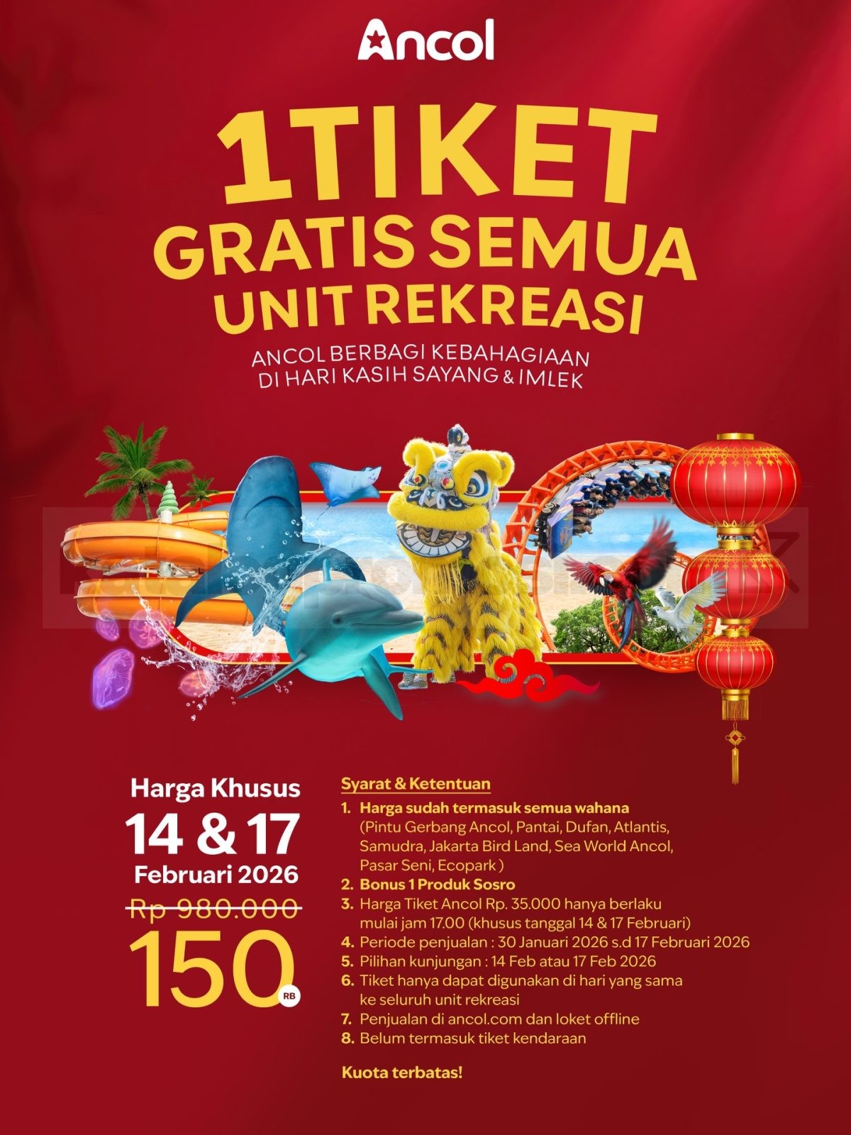 Promo Ancol 1 Tiket Gratis Semua Unit Rekreasi Rp. 150.000 berlaku 14 & 17 Februari 2026, sudah termasuk Dufan, Sea World, Atlantis, Samudra, dan unit lain di Ancol.