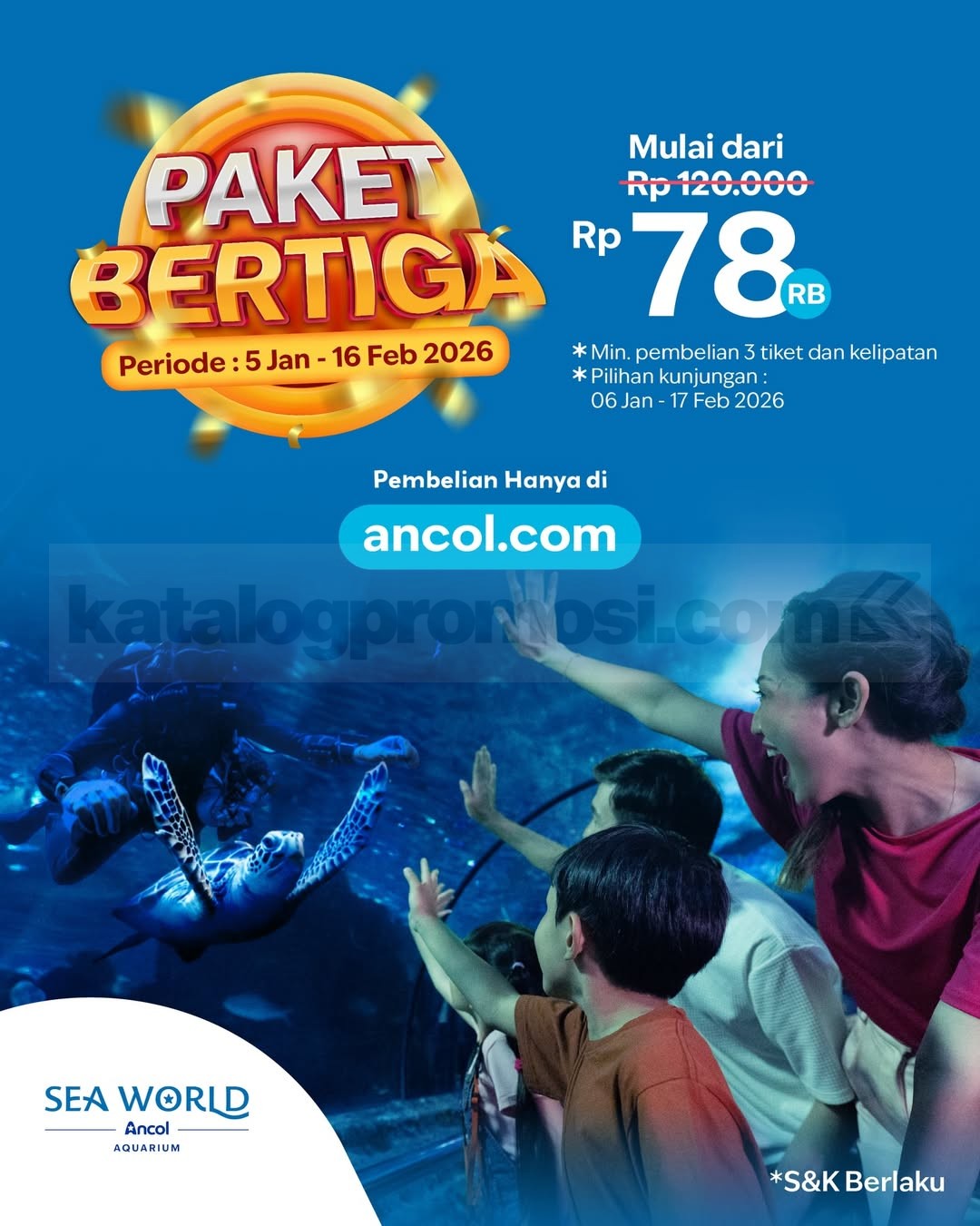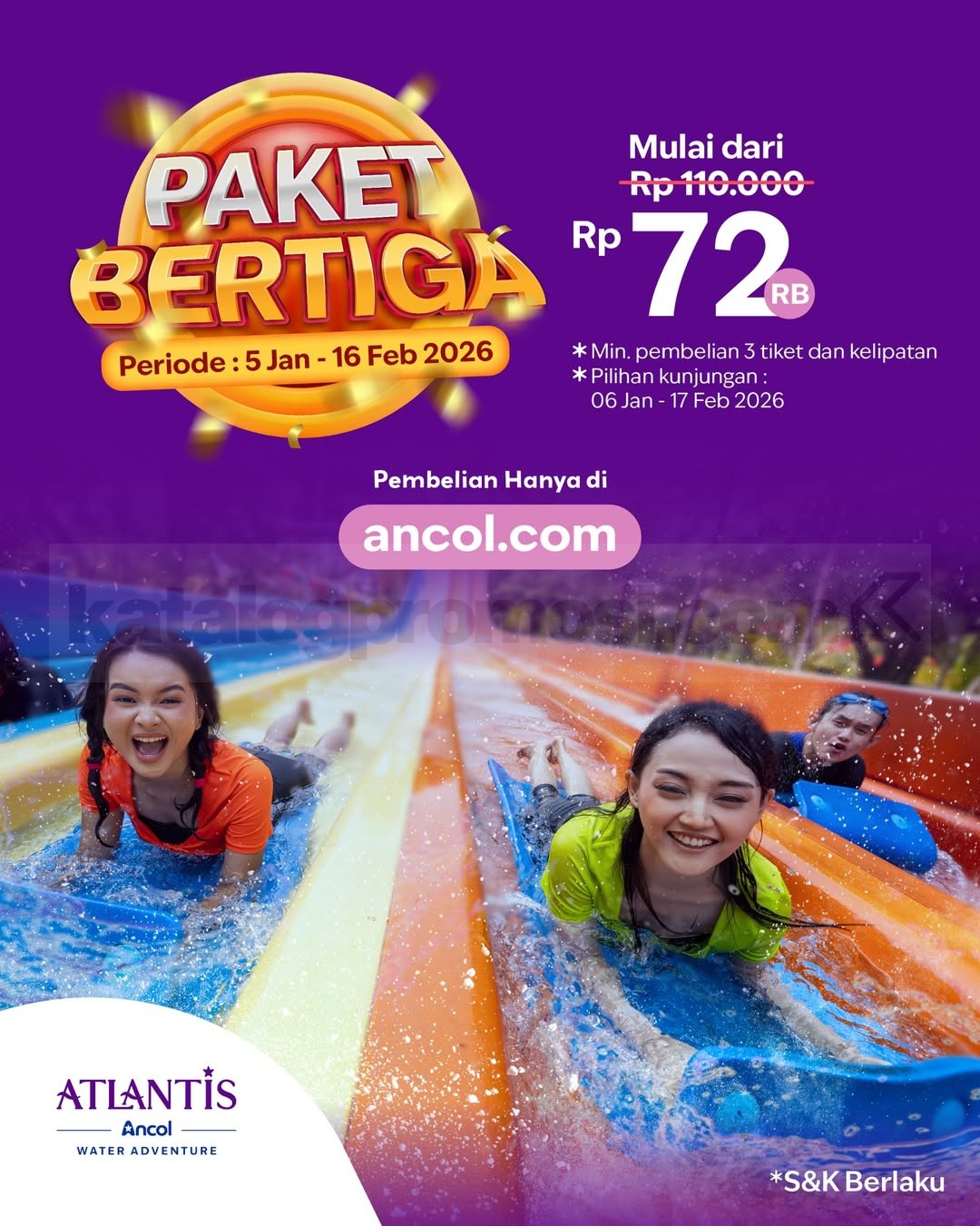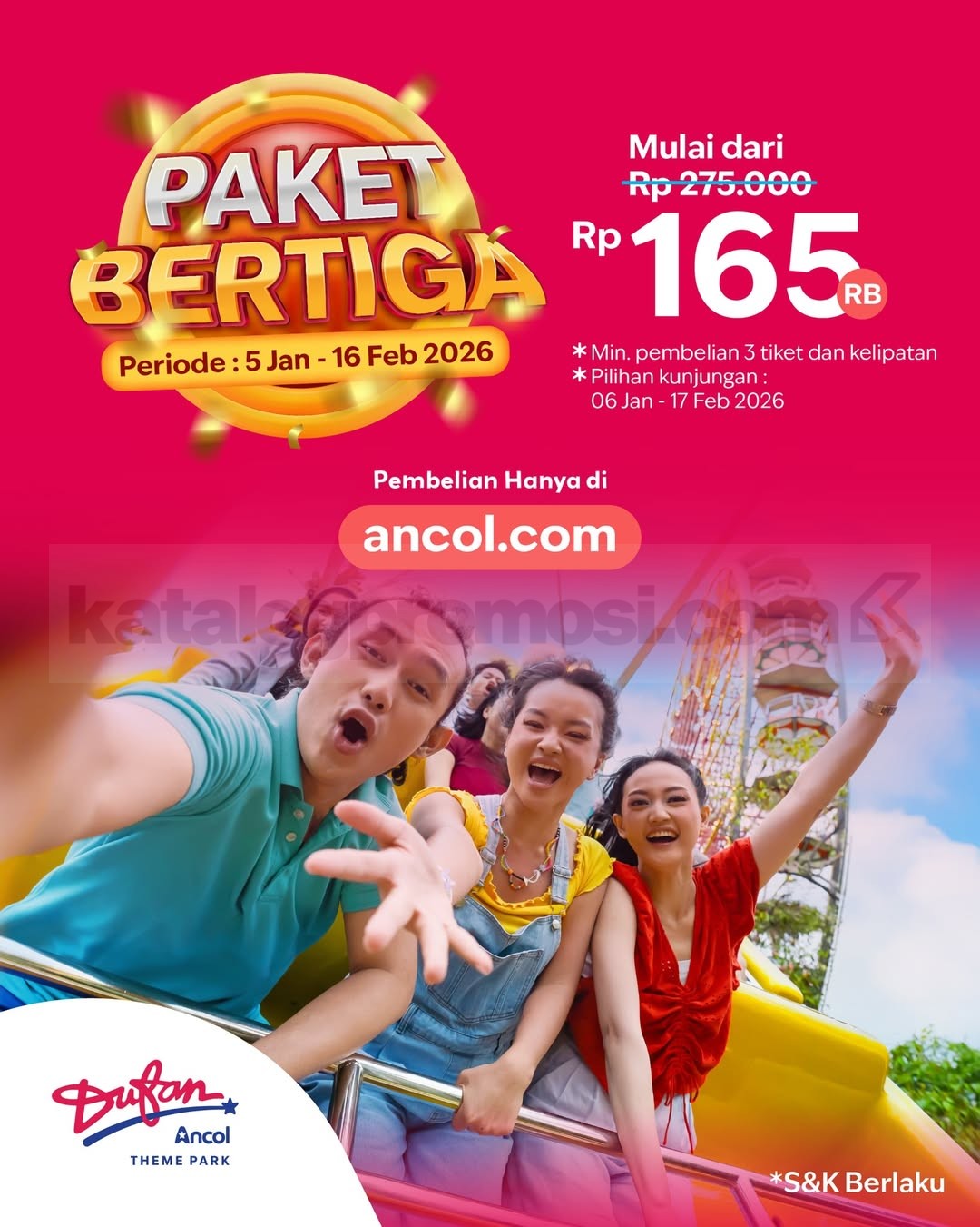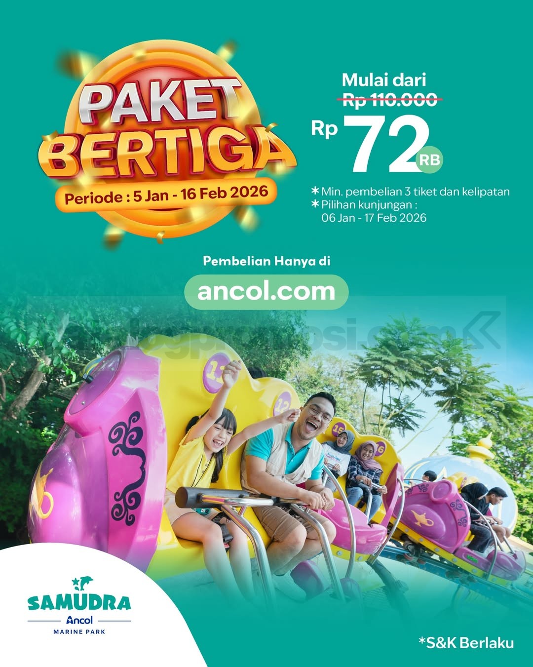 Program Promo Ancol Paket Bertiga berlangsung mulai 5 Januari 2026 sampai 16 Februari 2026, dengan pilihan tanggal kunjungan mulai 6 Januari 2026 hingga 17 Februari 2026.