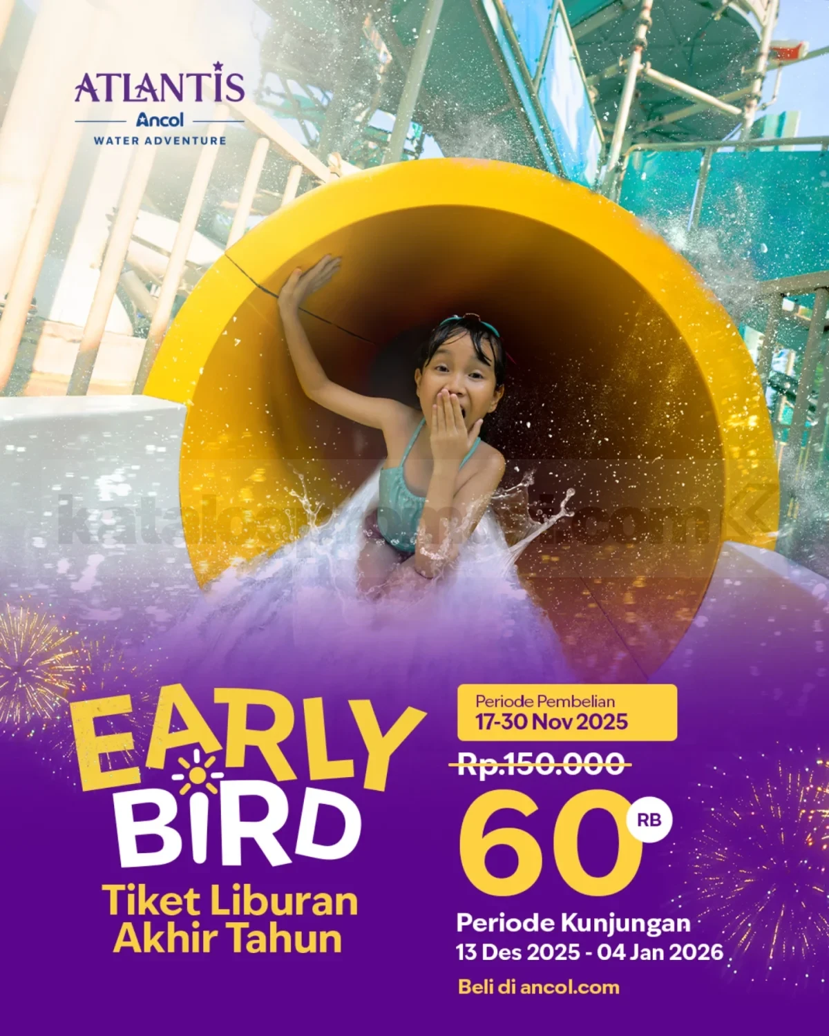 Liburan akhir tahun makin seru kalau direncanain dari sekarang! Manfaatkan promo Atlantis Ancol Early Bird Tiket Akhir Tahun Rp.60.000 ini sebelum sold out. Yuk ajak keluarga main air bareng dan nikmati momen bahagia di Ancol! ๐๐๏ธ