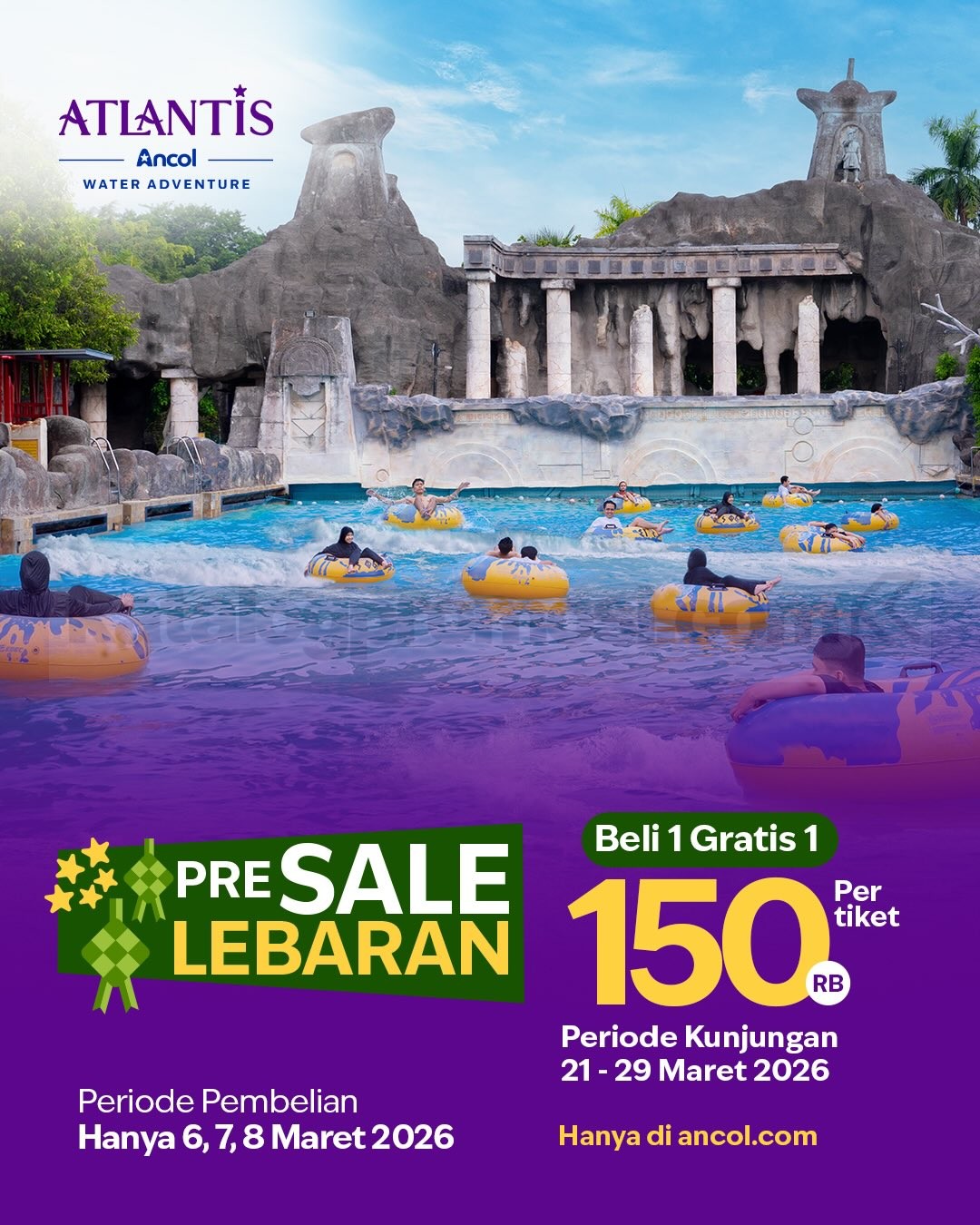 Promo Atlantis Ancol Presale THR Lebaran Beli 1 GRATIS 1 periode pembelian 6 – 8 Maret 2026 untuk kunjungan 21 – 29 Maret 2026 melalui ancol.com.