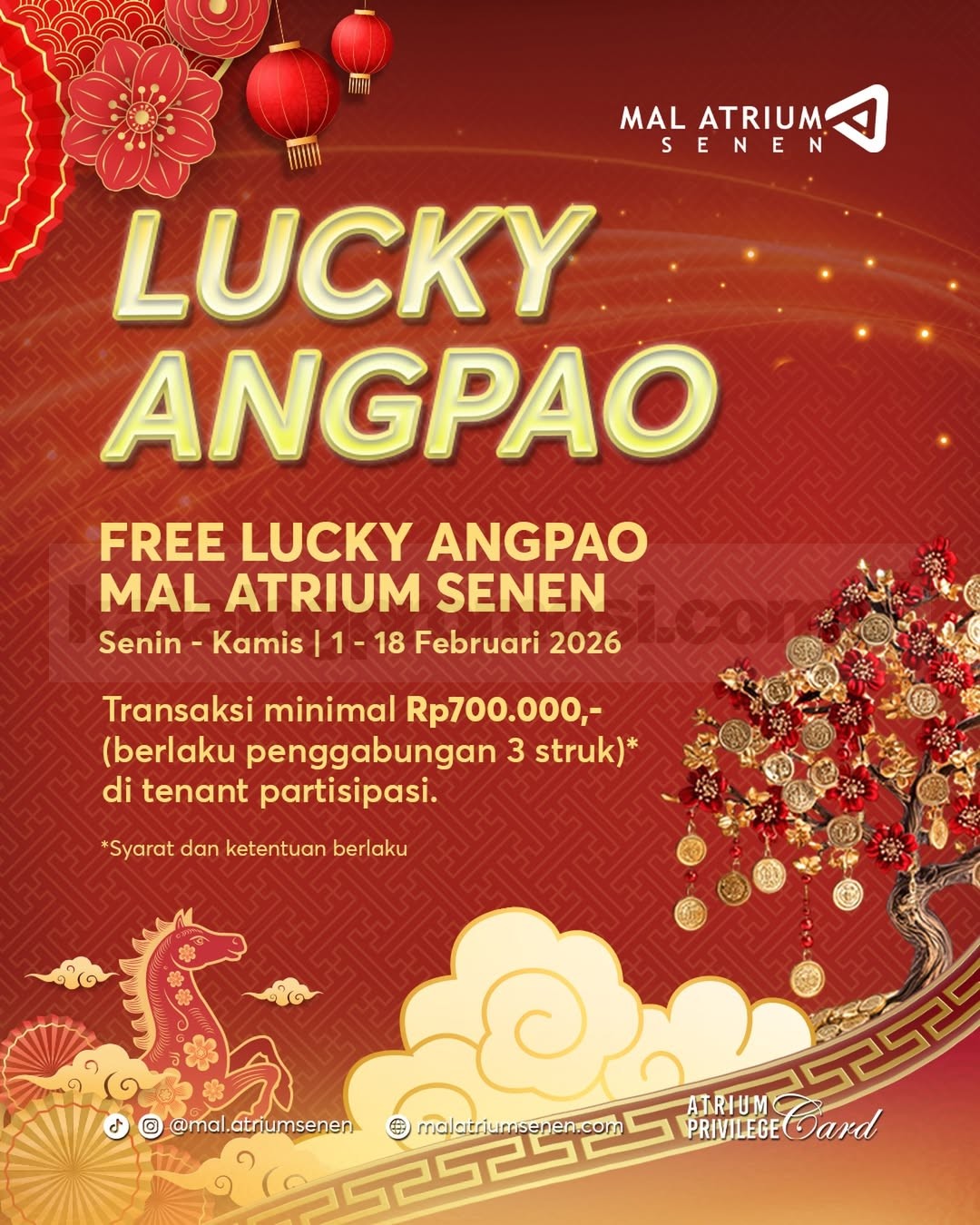 Promo Atrium Prosperity 2026 Imlek dengan Lucky Angpao berisi rewards menarik, hiburan seru, dan belanja menyenangkan, berlaku mulai 1 Februari – 18 Februari 2026 di Mal Atrium Senen.