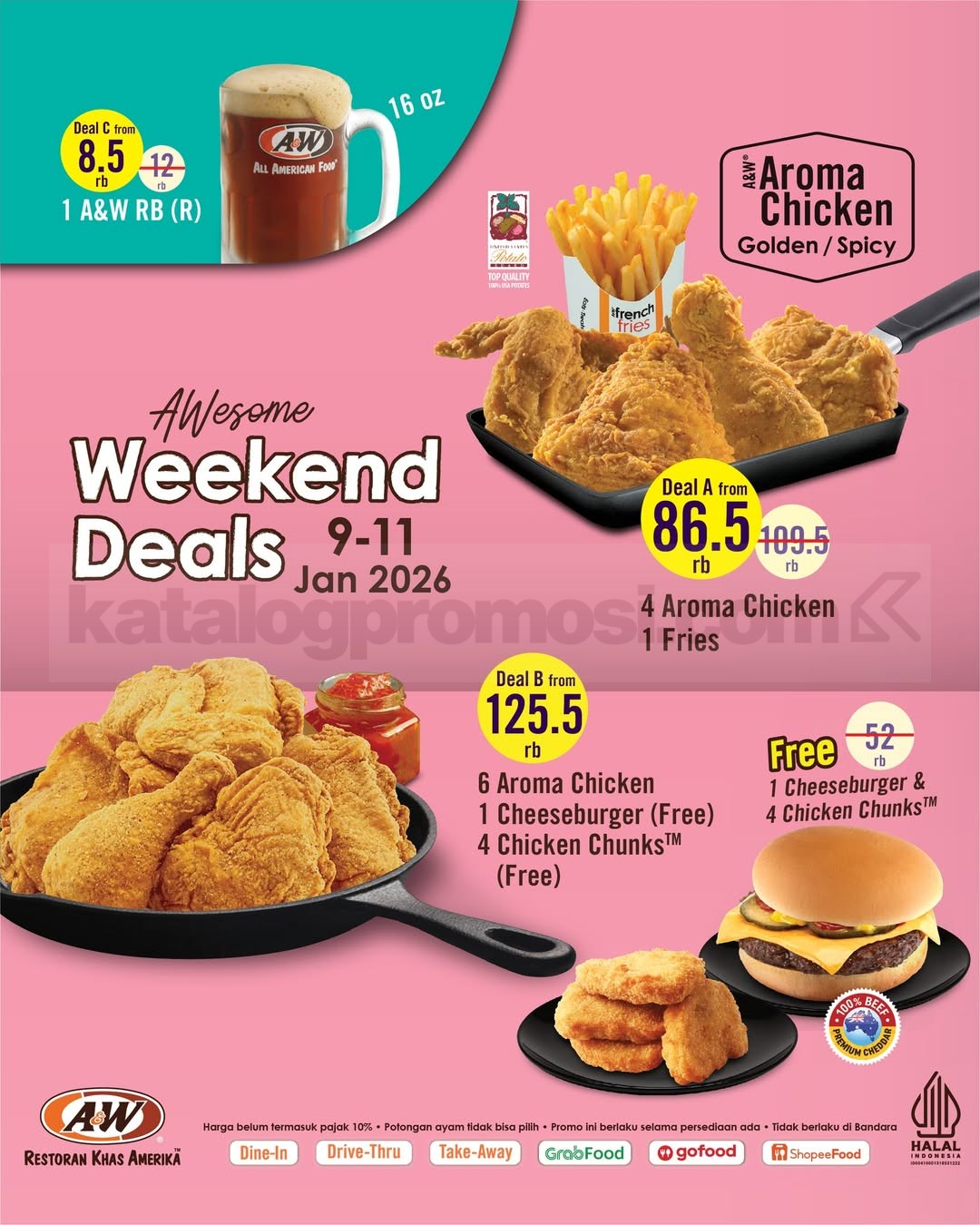 Promo A&W AWesome Weekend Deals mulai Rp. 8.500 dengan pilihan paket ayam dan minuman hemat berlaku mulai tanggal 9 Januari 2026 – 11 Januari 2026 di seluruh outlet kecuali bandara.