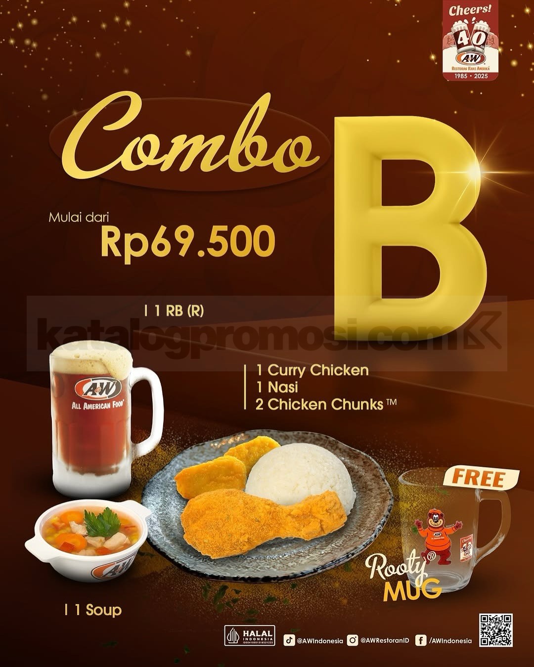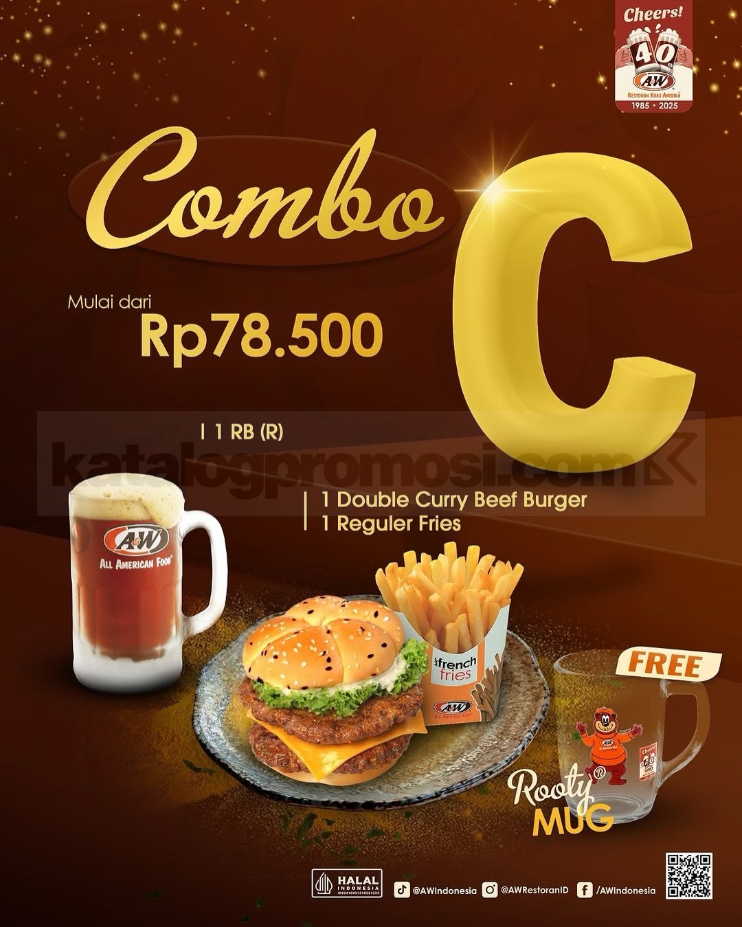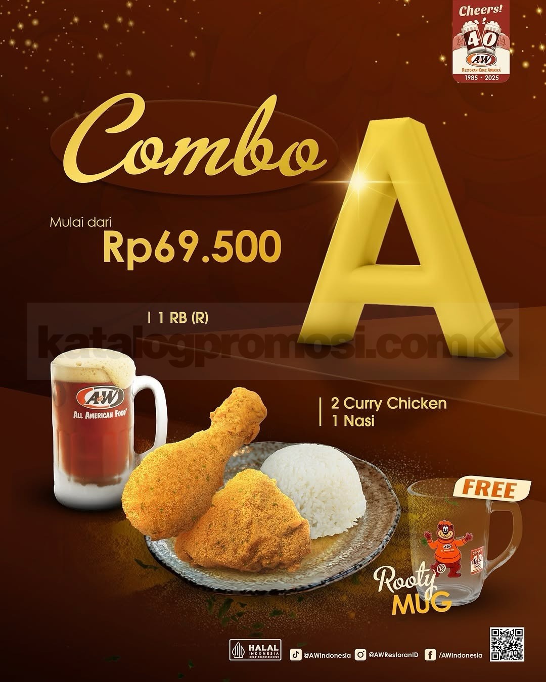 Promo A&W Curry Combo + Gelas Rooty Mug mulai Rp. 69.500 nikmati pilihan combo curry gurih lengkap dengan Root Beer berlaku periode terbatas di outlet tertentu