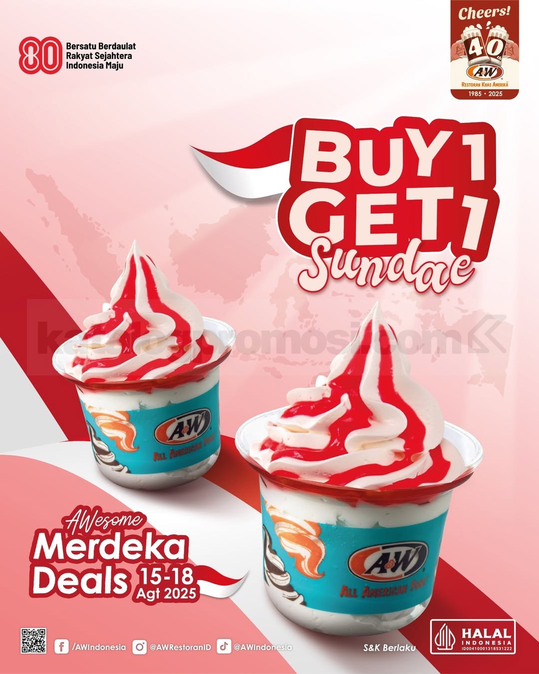 Promo A&W Merdeka Deals hadir buat temenin kamu rayain Hari Kemerdekaan dengan cara paling manis 🎉🇮🇩🍦. Selama periode 15–18 Agustus 2025, cukup beli 1 Sundae di store A&W manapun, kamu langsung dapetin 1 Sundae GRATIS! Promo A&W Merdeka Deals berlaku di semua outlet termasuk bandara — cocok buat bikin hari kamu makin chill habis ikutan lomba 17-an. Tanpa minimal transaksi, tanpa batas maksimal pembelian, tinggal datang dan nikmatin Promo A&W Merdeka Deals selagi stok masih ada. Kalau takeaway, bakal kena sedikit biaya tambahan ya. Yuk serbu sebelum kehabisan! 😍🔥