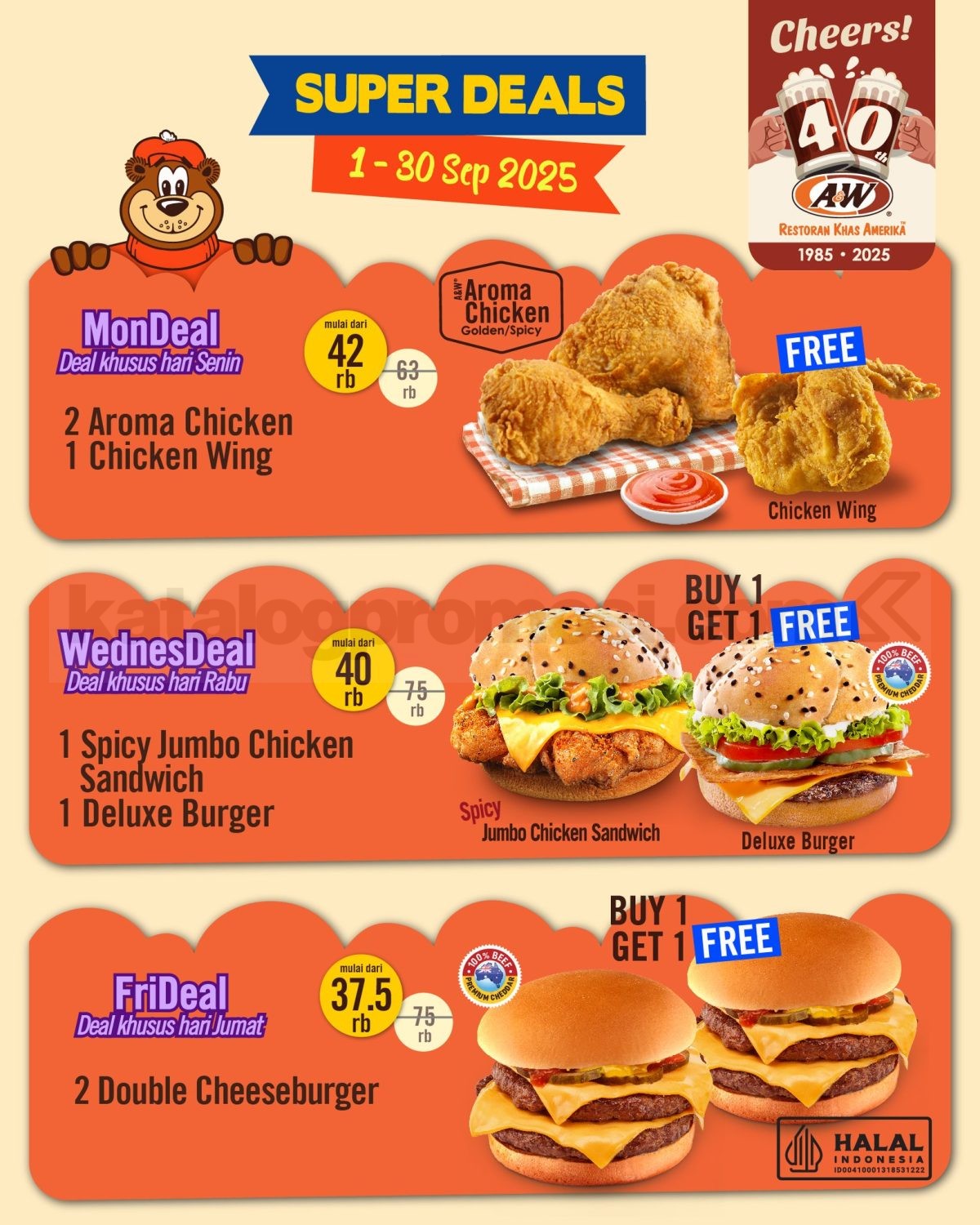 Promo A&W SuperDeals September 2025 diskon hingga 50% berlaku setiap Senin, Rabu, dan Jumat mulai 1 – 30 September 2025 di outlet tertentu.