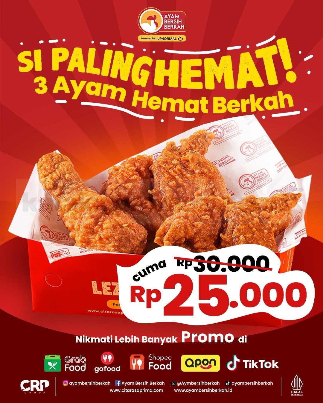 Promo Ayam Bersih Berkah 3 Ayam Hemat Berkah Rp. 25.000 menawarkan paket ayam ekonomis untuk konsumsi harian, berlaku selama persediaan masih ada di outlet tertentu.