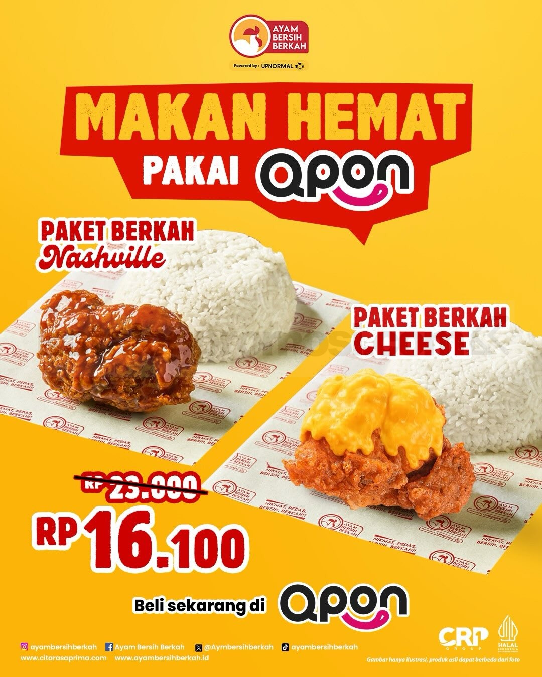 Promo Ayam Bersih Berkah Cheese & Nashville Rp. 16.100 pakai Qpon, nikmati menu hemat dengan scan QPON berlaku selama periode promo di merchant tertentu