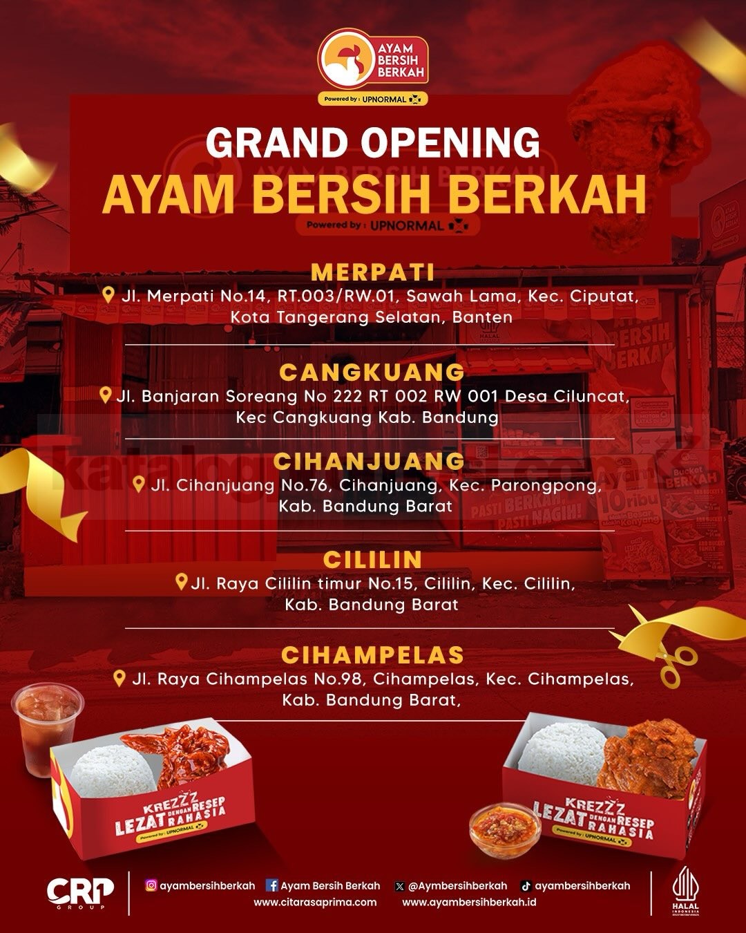 Ayam Bersih Berkah resmi buka di banyak titik dan langsung bikin suasana makin ramai dengan aroma ayam crispy renyah dan ayam merah juicy yang menggoda. Promo Ayam Bersih Berkah Grand Opening ini jadi momen pas buat kamu yang suka ayam goreng berbumbu kuat dengan harga yang bikin dompet tetap aman 🍗🔥