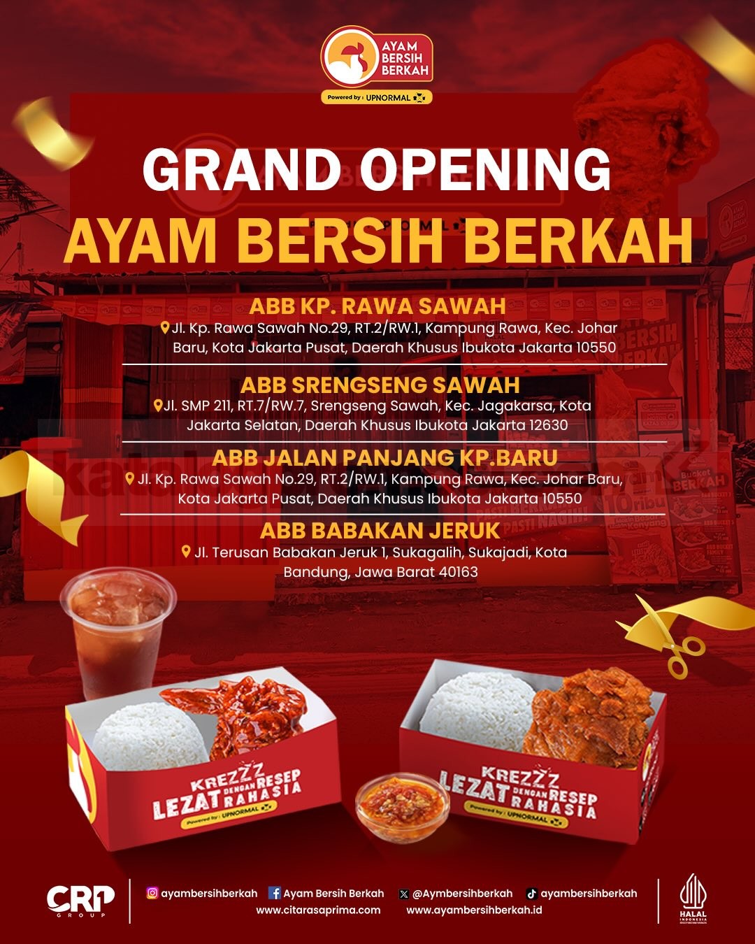 - Promo hanya berlaku di outlet Ayam Bersih Berkah yang berpartisipasi dalam Grand Opening.