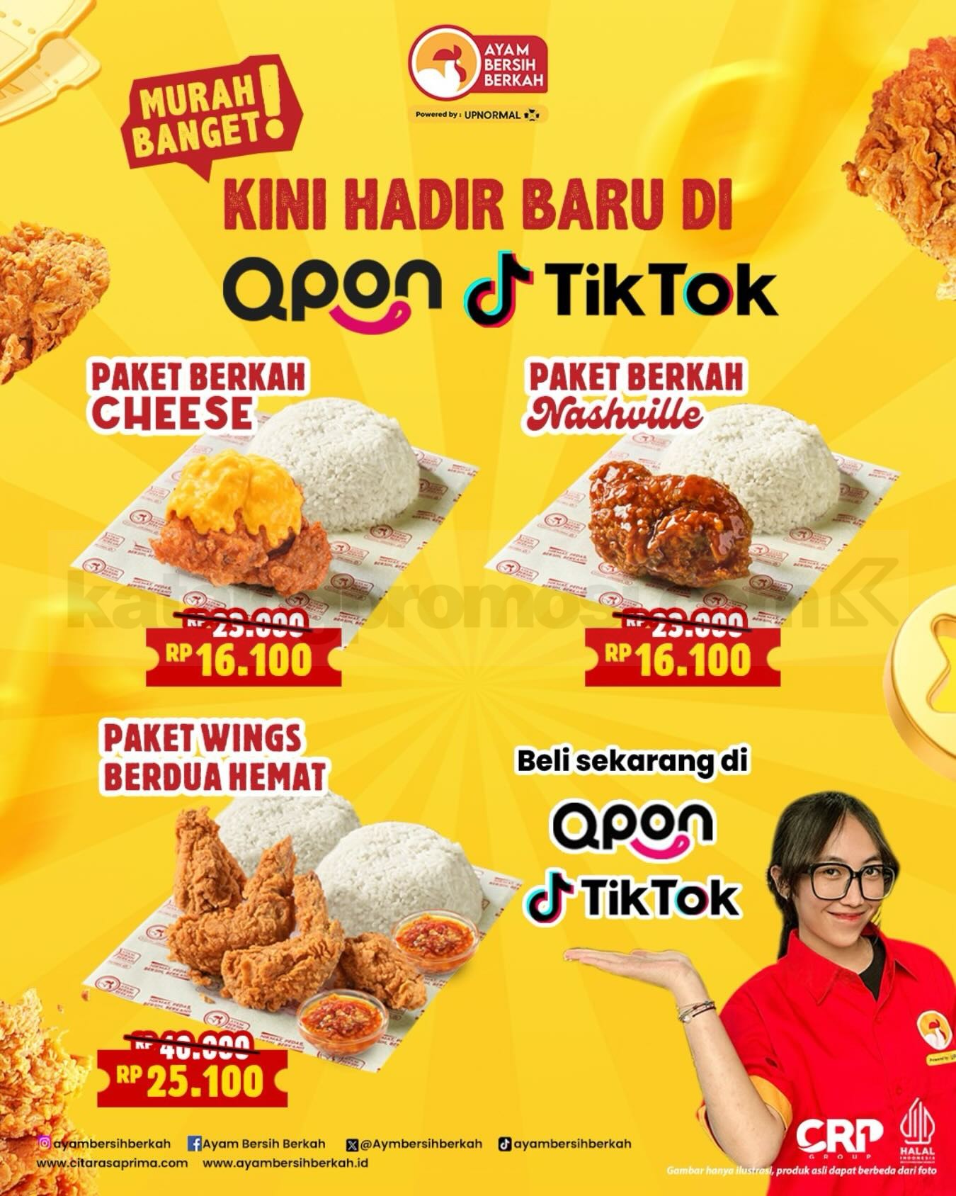 Dengan harga mulai Rp. 16.100, kamu sudah bisa menikmati berbagai pilihan paket ayam crispy dari Ayam Bersih Berkah dengan rasa yang khas dan porsi yang pas. Kalau lagi cari menu makan hemat tapi tetap nikmat, promo ini bisa jadi pilihan menarik. Yuk langsung checkout paket favoritmu lewat QPON atau TikTok Shop sebelum stok promo berakhir.