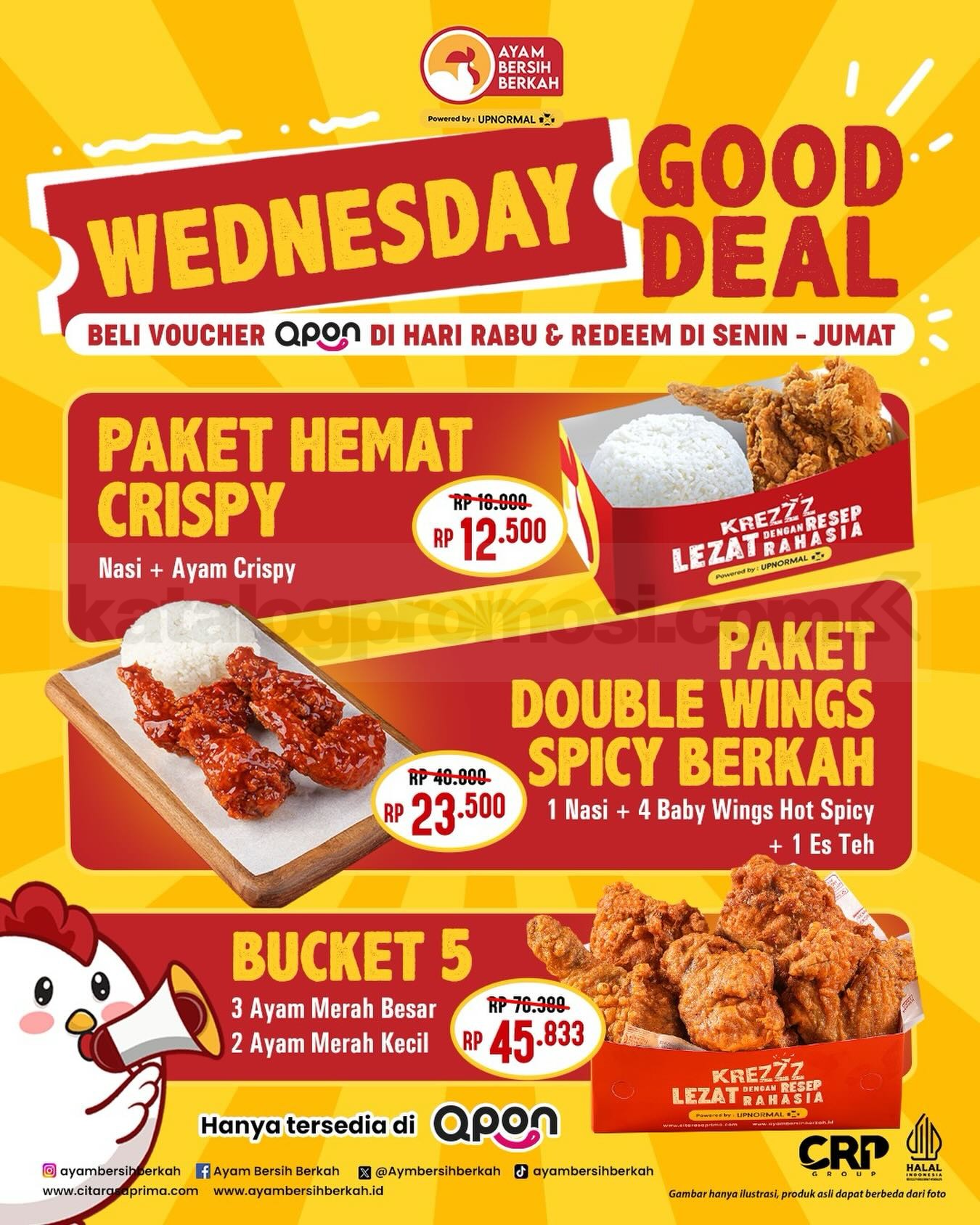 Promo Ayam Bersih Berkah Wednesday mulai Rp. 12.500 untuk paket hemat dan bucket via voucher QPON berlaku tanggal 29 April 2026 pada hari Rabu dan bisa di redeem hari senin-jumat.