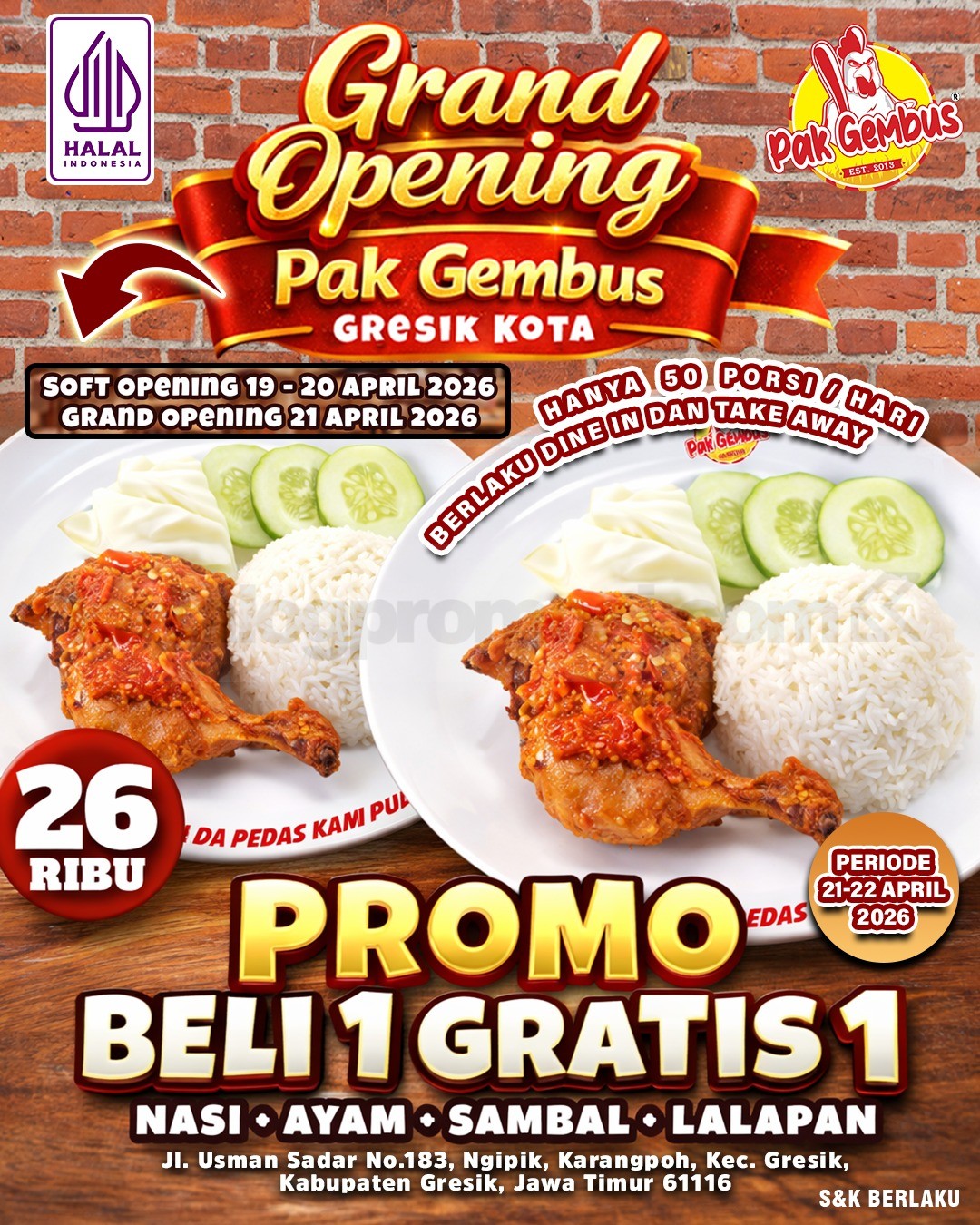 Promo berlangsung tanggal 21 – 22 April 2026 sebagai bagian rangkaian pembukaan outlet Ayam Gepuk Pak Gembus Gresik setelah Soft Opening tanggal 19 – 20 April 2026 dan Grand Opening tanggal 21 April 2026.