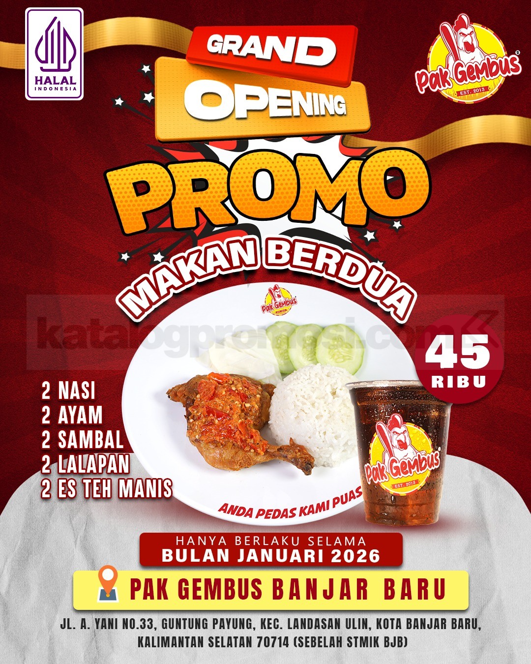 Promo Ayam Gepuk Pak Gembus Grand Opening Banjar Baru makan berdua Rp. 45.000 dengan paket lengkap, mekanisme dine-in, berlaku selama bulan Januari 2026.
