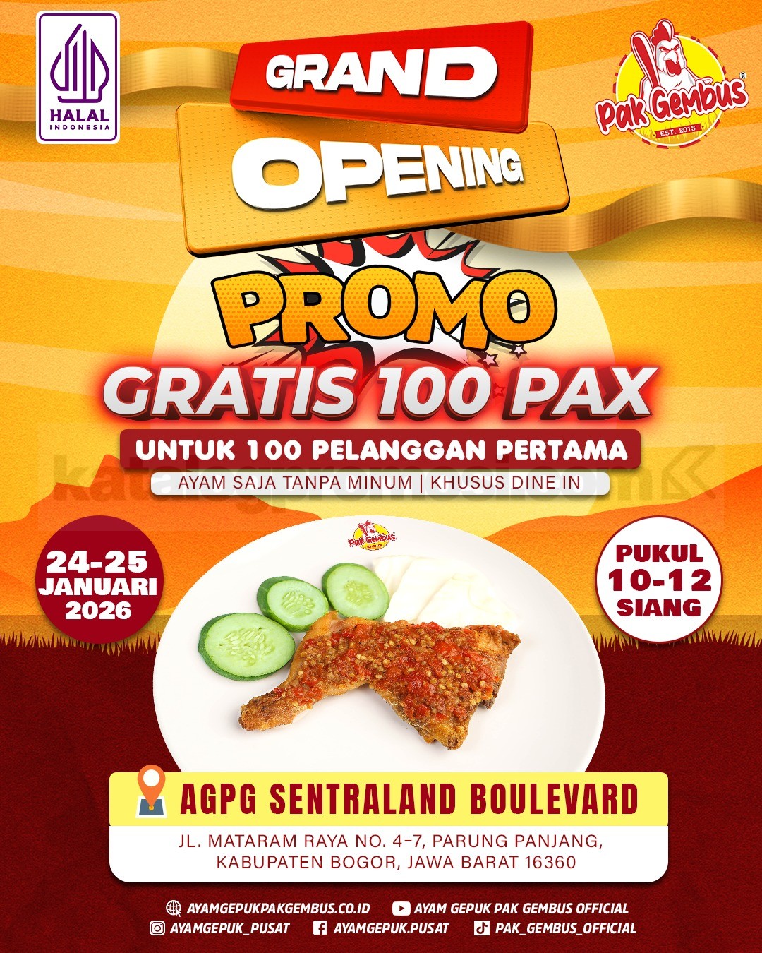 - Promo berlaku khusus saat grand opening AYAM GEPUK PAK GEMBUS Sentraland Boulevard.