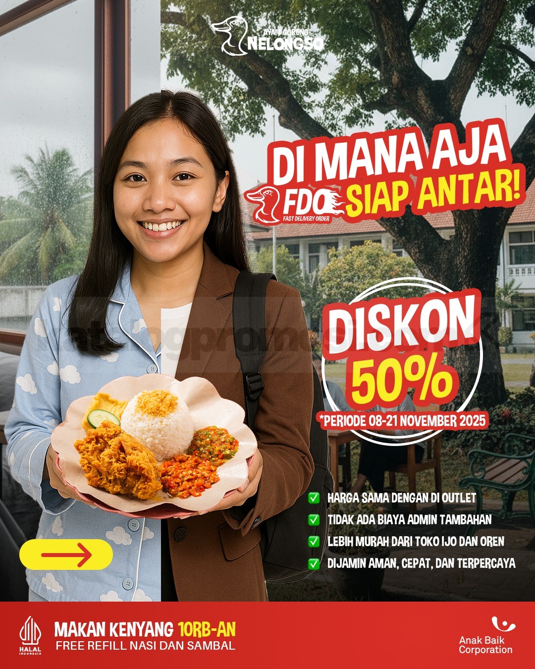 Iya beneran, promo ini berlaku eksklusif di Fast Delivery Order (FDO) Ayam Goreng Nelongso buat kamu yang pengin makan enak tanpa ribet keluar rumah.