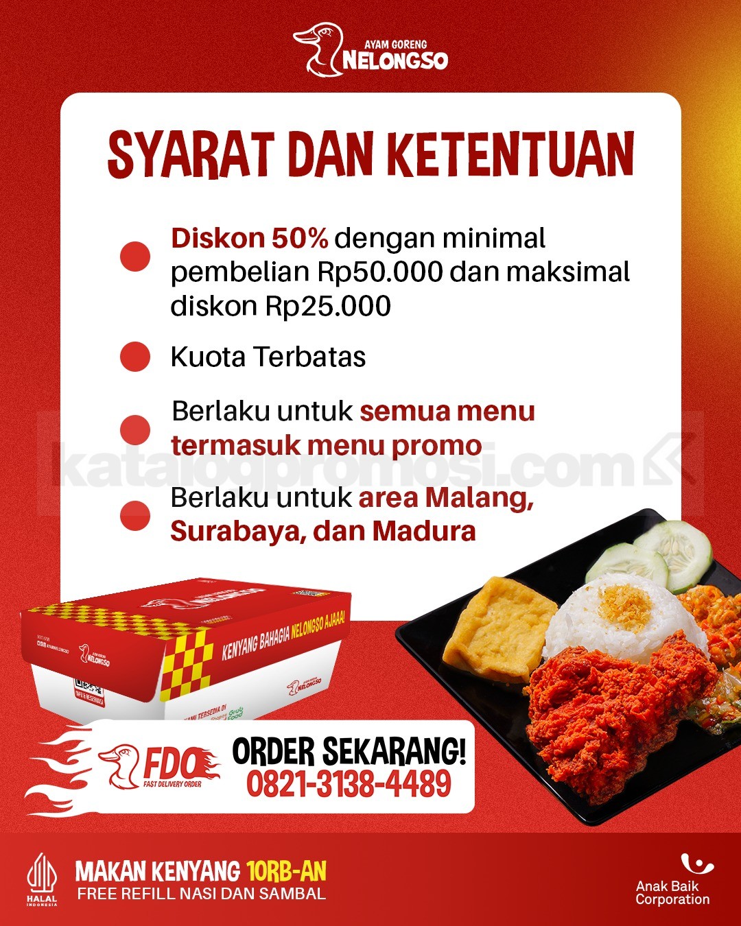 Buat yang belum sempet mampir ke outlet, sekarang gak perlu khawatir! Langsung pesan lewat Fast Delivery Order (FDO) dengan kontak resmi di 0821-3138-4489 biar gak kehabisan kuota promonya. Yuk buruan cobain dan rasain nikmatnya promo hemat dari Ayam Goreng Nelongso 🔥
