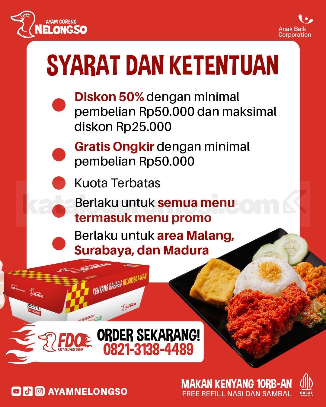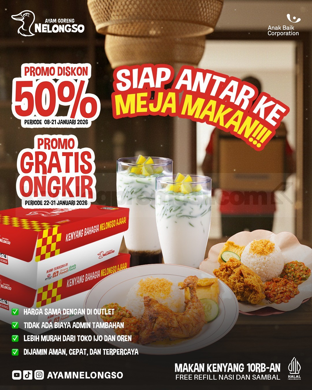 Promo Ayam Goreng Nelongso Diskon 50% Gratis Ongkir dengan minimal belanja Rp. 50.000, berlaku mulai tanggal 8 Januari 2026 – 31 Januari 2026 di Malang, Surabaya, dan Madura.