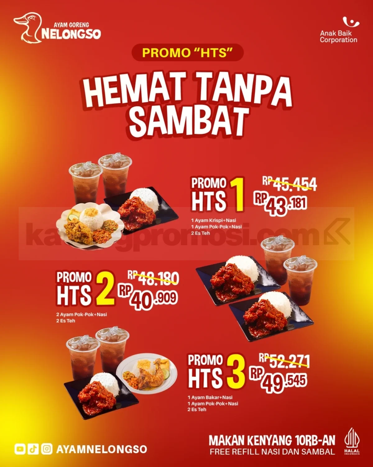 Promo Ayam Goreng Nelongso HTS Paket Hemat Mulai Rp. 40.909 paket berdua termasuk es teh dan free refill nasi sambal berlaku selama periode promo berlangsung di seluruh outlet.