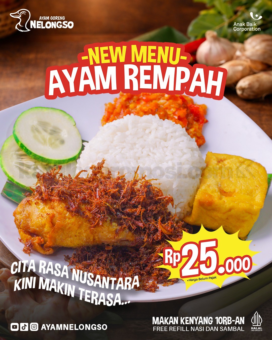 Promo Ayam Goreng Nelongso NEW! Ayam Rempah Rp. 25.000 dengan bumbu Nusantara meresap dan taburan rempah kriuk, berlaku mulai Februari 2026 di seluruh outlet.