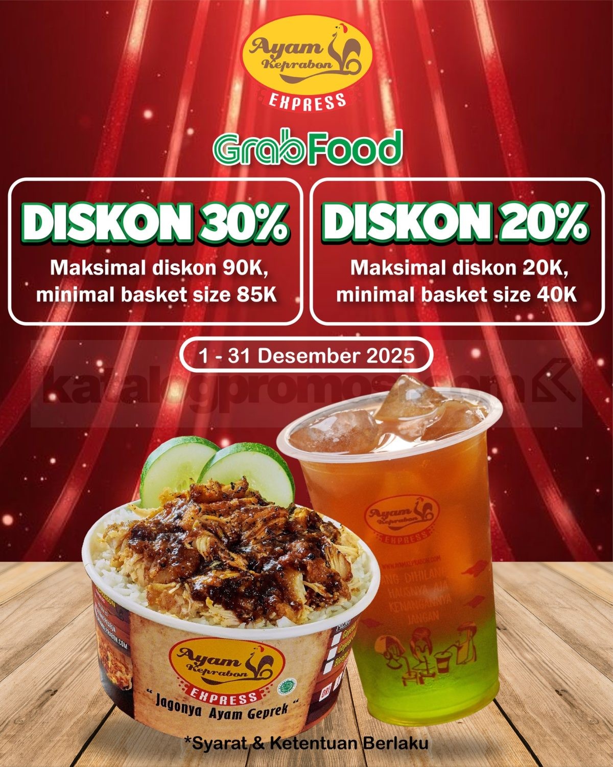 Promo Ayam Keprabon GrabFood Diskon Hingga 30% untuk pesanan minimal Rp. 85β90 ribu, berlaku 1 β 31 Desember 2025 via aplikasi GrabFood.