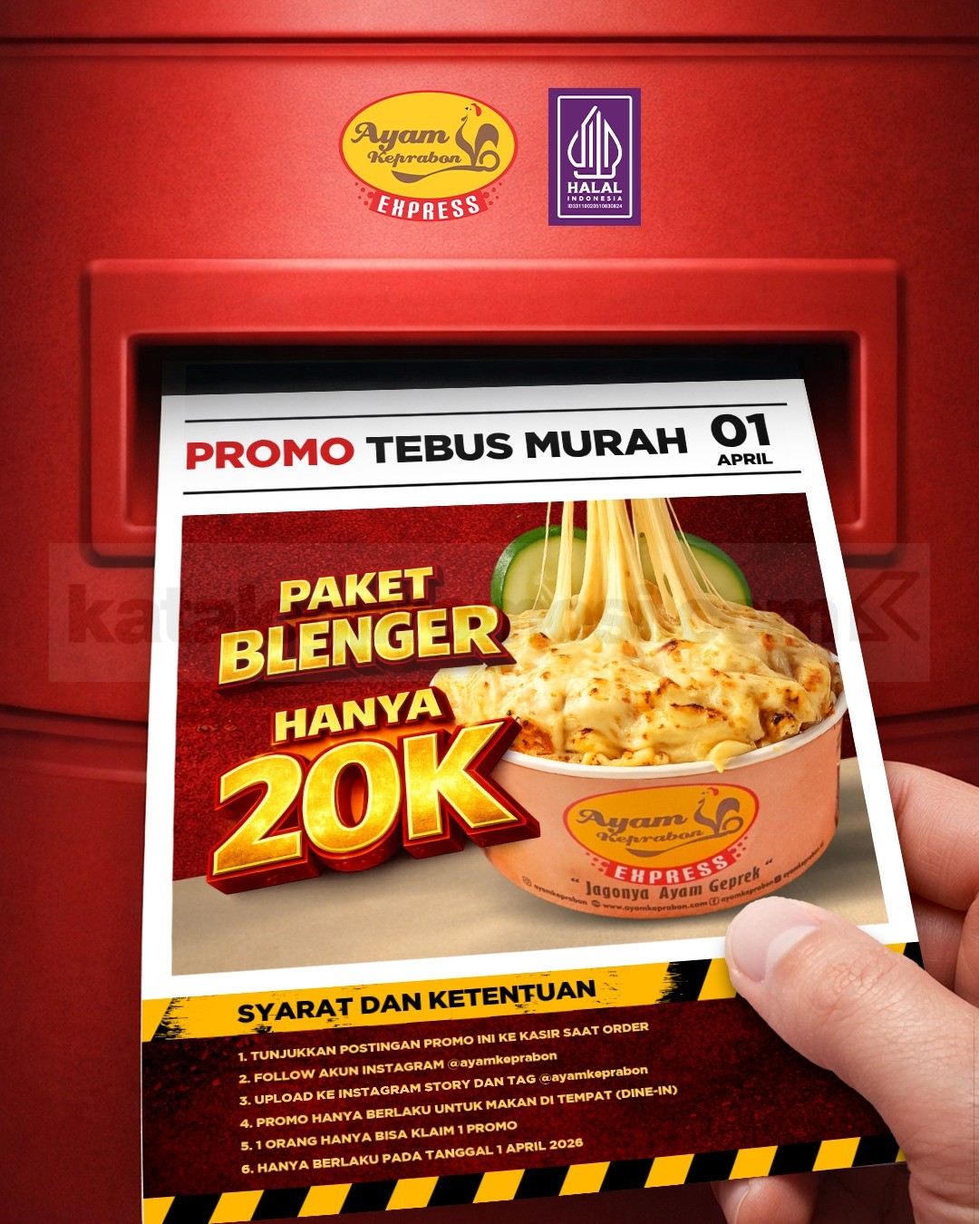 Promo ini berlaku terbatas hanya di tanggal 1 April 2026. Untuk bisa menikmati penawaran ini, kamu cukup menunjukkan postingan promo ke kasir, follow akun Instagram @ayamkeprabon, lalu upload ke Instagram Story dengan tag akun mereka. Penawaran ini berlaku khusus untuk dine-in dan setiap orang hanya bisa klaim satu kali selama periode berlangsung.