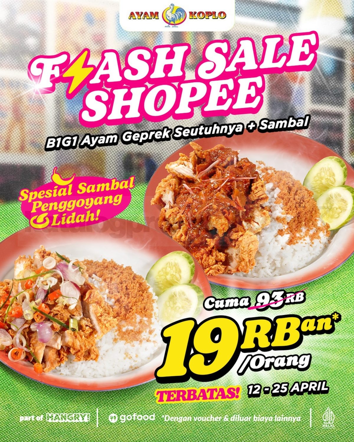 Promo Ayam Koplo ShopeeFood B1G1 mulai Rp. 19.000 per orang untuk ayam geprek utuh dengan sambal via aplikasi ShopeeFood di outlet tertentu