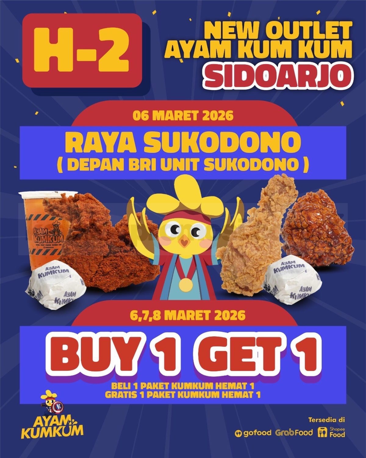 Promo Ayam Kum Kum Grand Opening Sidoarjo Beli 1 Gratis 1 Gratis 1 Paket Kumkum Hemat 1 setiap pembelian berlaku mulai tanggal 6 Maret 2026 – 8 Maret 2026 di Raya Sukodono.
