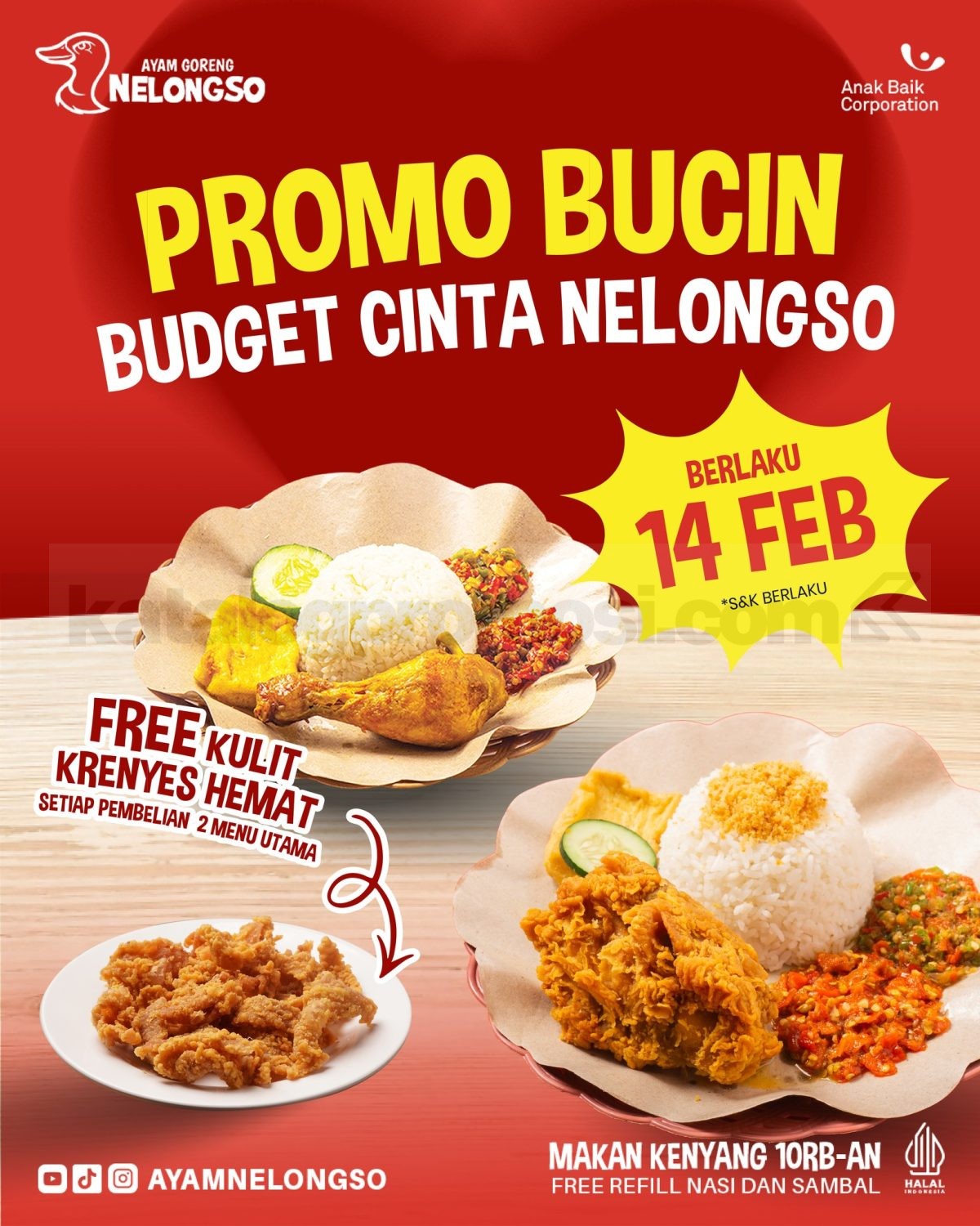 Nikmati momen spesial bareng orang tersayang dengan Promo Ayam Nelongso Budget Cinta Nelongso Free Kulit Kremes dan rasakan sensasi makan kenyang plus bonus gurihnya kulit kremes di tanggal 14 Februari 2026.